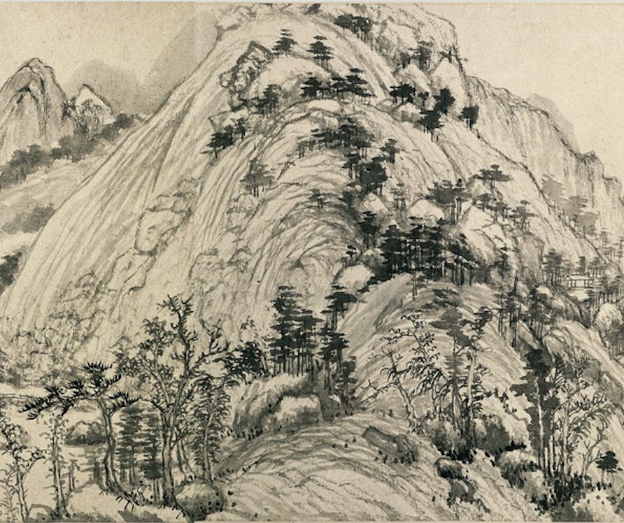 第二部分山脉转折,树木土坡、房屋江舟更有层峦环抱、山野人家的萧瑟感。近处松柏呼应远处山势,承先启后路转峰回。