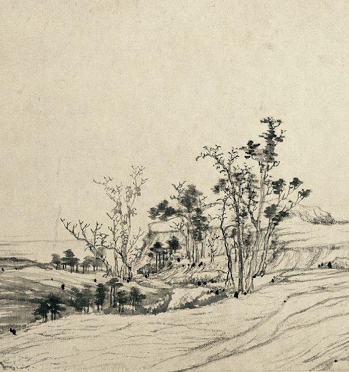 画中马匹人物、树木土坡皆富西方透视的立体感;但松针树皮的墨线勾勒,石块土坡的线条皴擦等,仍深谙中国传统绘画技法的精髓。