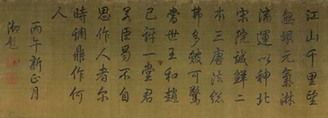 全幅整绢画成,有清弘历题诗,后隔水有宋朝蔡京的跋一,尾纸有元朝李溥先的题一。打开卷轴包首,引首即可见朱红印章数枚,以及卷首题诗。