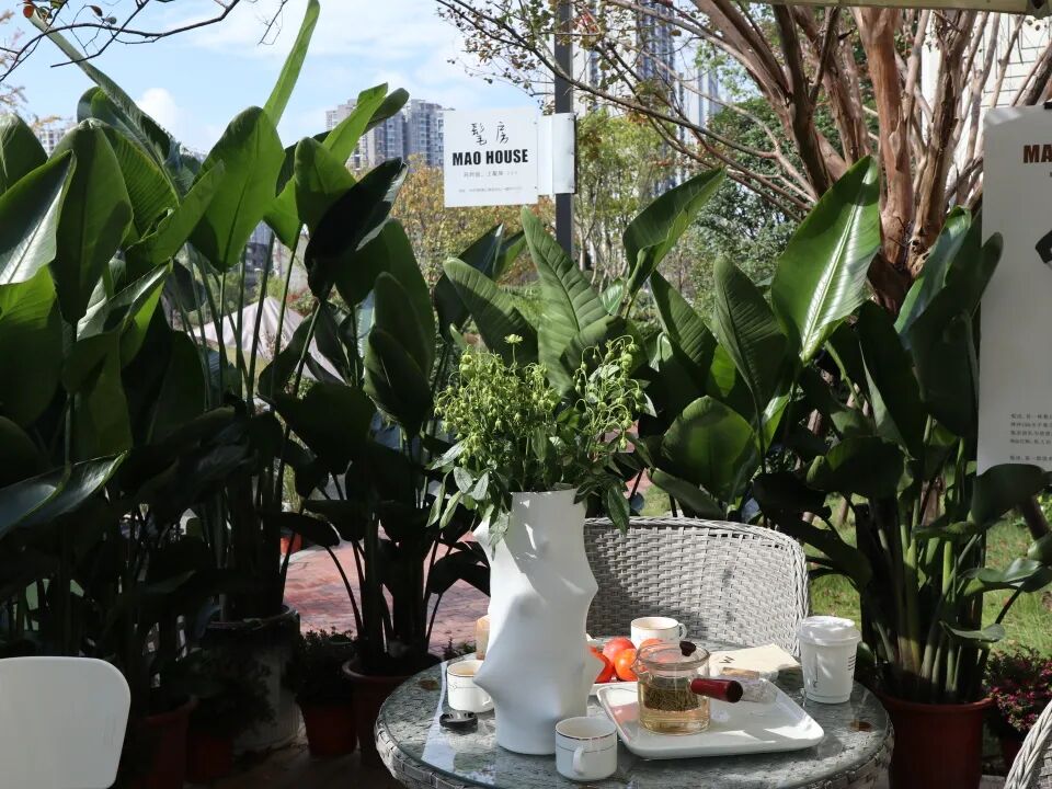 走进髦房 MAO HOUSE,映入眼帘的就是一整块绿意盎然的空间,从室外到室内都摆满了绿植和鲜花,显得生机蓬勃。如果不是看到门口的成衣展示,恐怕人们会以为这里是一家藏在产业园区的咖啡厅。
