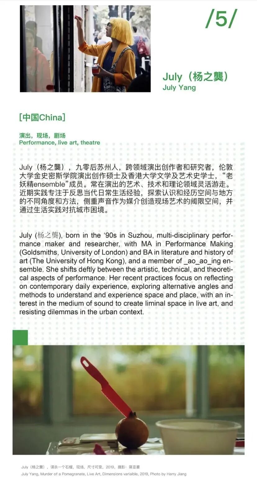 July(杨之龑),香港大学文学及艺术史学士,伦敦⼤学⾦匠学院演出创作硕士,“老妖精ensemble”成员。曾在世界多地进行在地创作,作品涉及声音及剧场等多种形式。