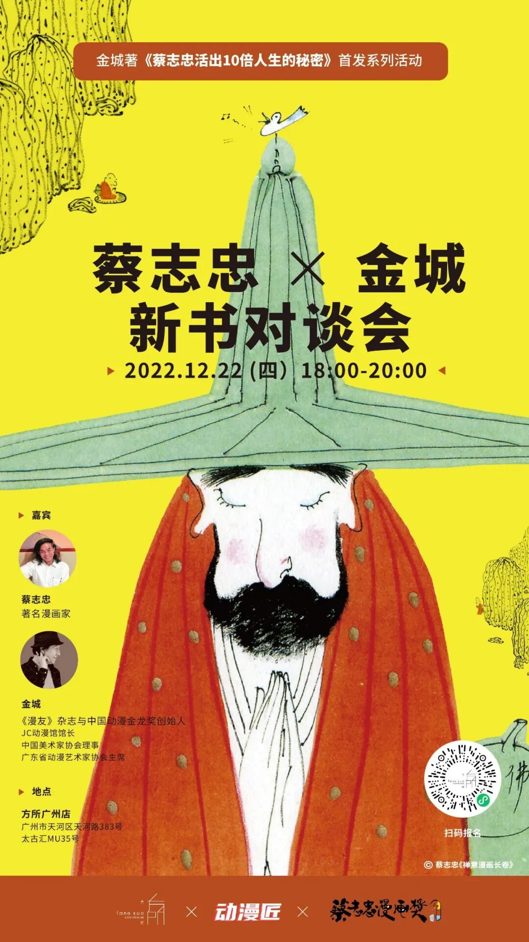 12月22日晚,方所广州店将邀请到著名华语漫画家蔡志忠老师及《漫友》杂志与中国动漫金龙奖创始人、JC动漫馆馆长金城老师在方所广州店围绕新书《蔡志忠活出10倍人生的秘密》的创作契机及主题内容进行对谈,同时也会针对读者时下关心的问题进行互动交流。新书对谈,亦是一场蔡志忠答青年问的互动交流会。