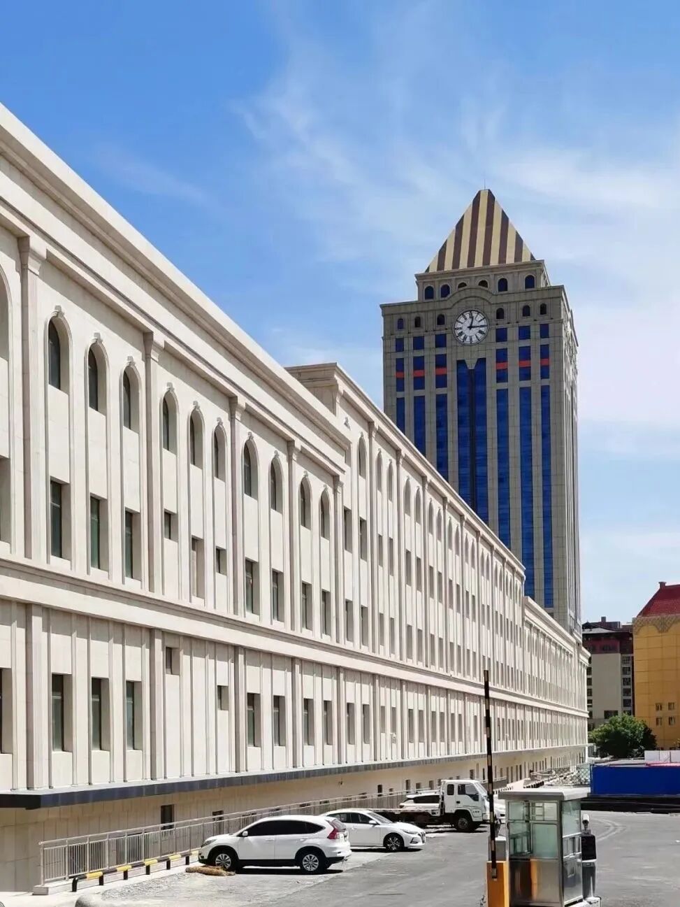 城市风貌更像是内地的一个刚刚由镇发育成的县城,或者是一个开发区。大部分区域还在大刀阔斧建设之中,布满脚手架的未完工建筑林立,看上去参差不齐,由于过于崭新,城市景观并没有太多特色。在新疆的茫茫荒野中经常能看到一座座集装箱小屋,这里或许是一个放大版。