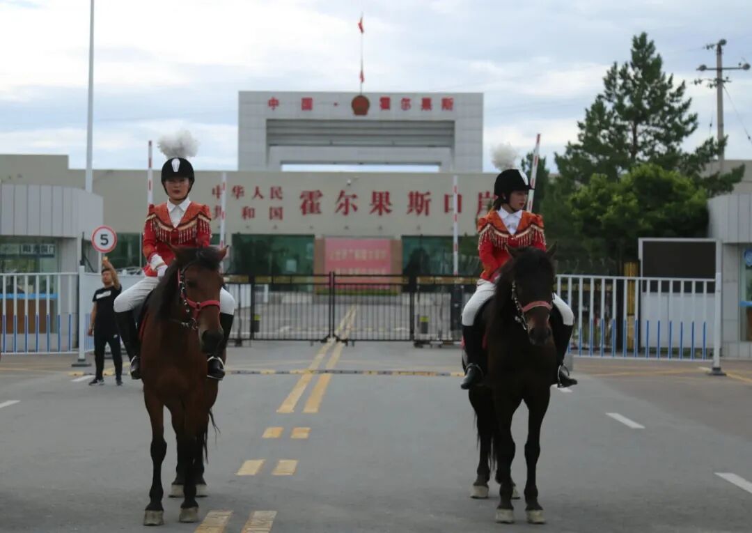 国门霍尔果斯口岸、英姿飒爽的女骑手和从口岸奔向远方的摩托车骑手 © 李昊