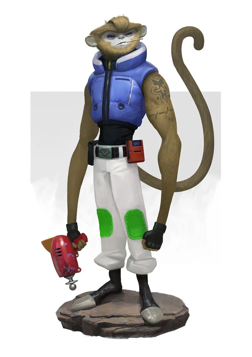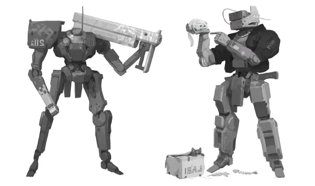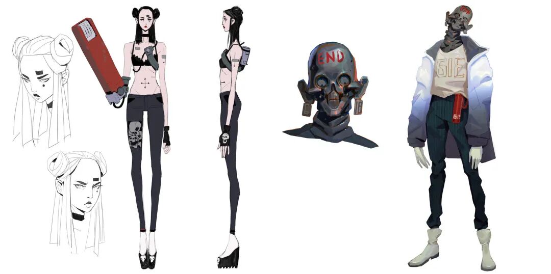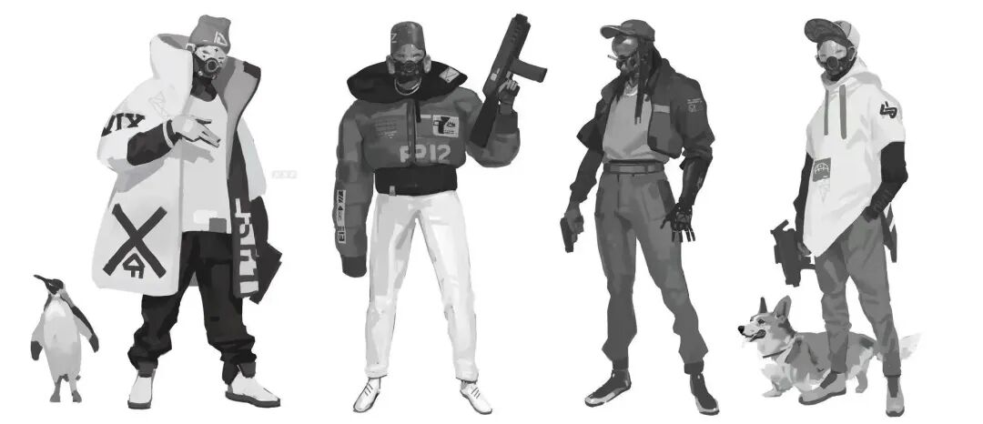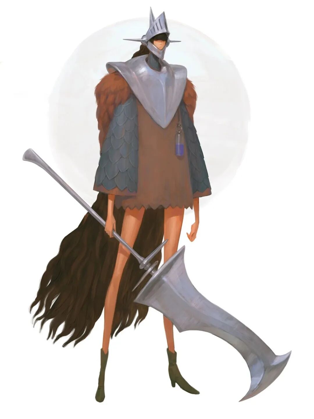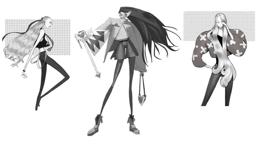 他笔下的人物往往拥有一双逆天的大长腿,动物和机械的融合脑洞很大,结构比例略显夸张,服饰怪异但细节满满,整体设计感十足。