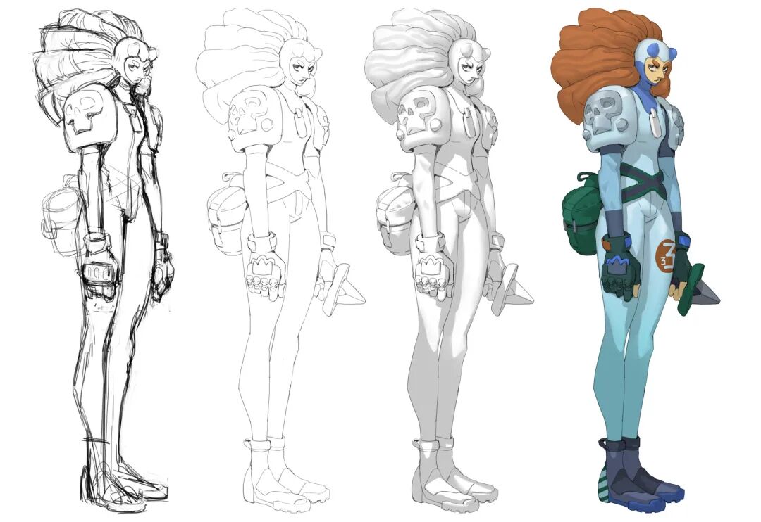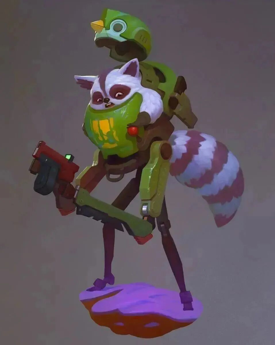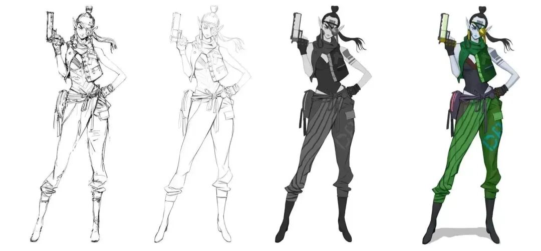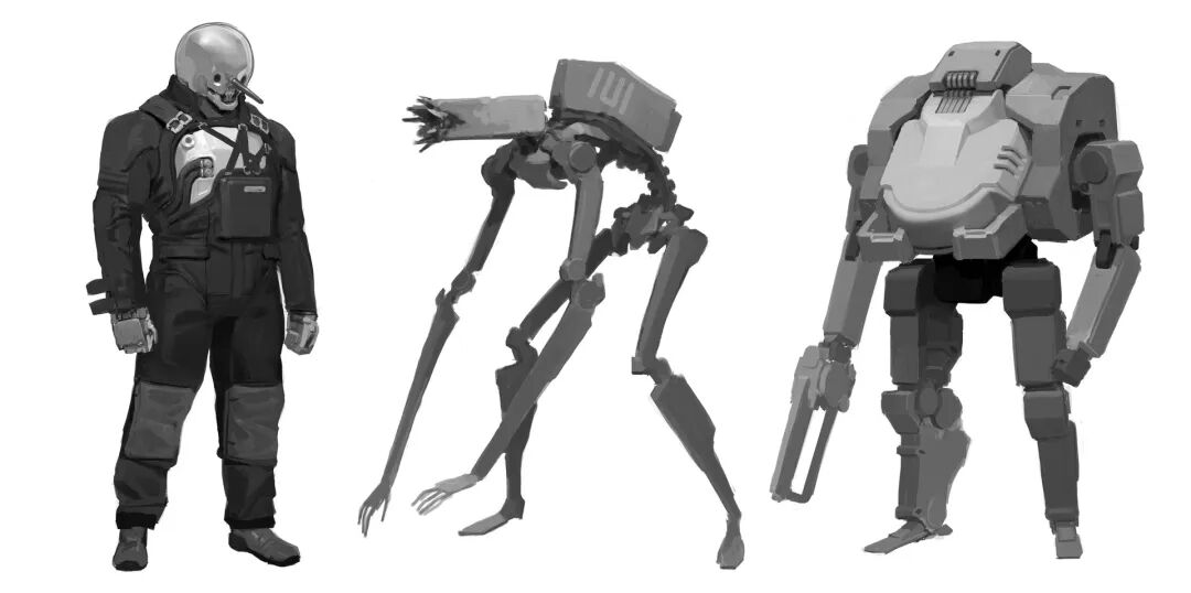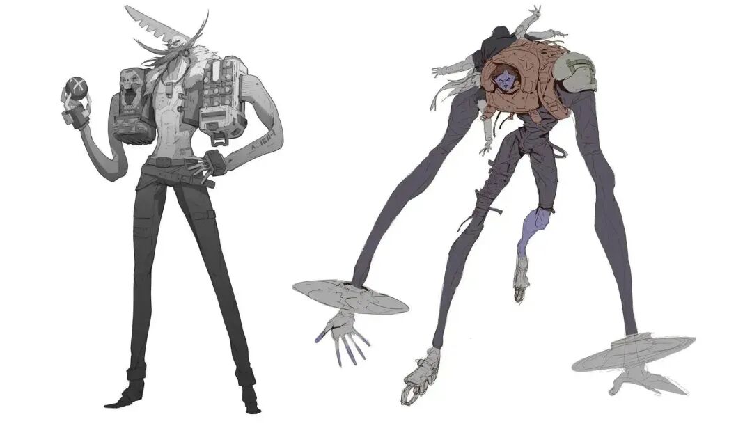 他笔下的人物往往拥有一双逆天的大长腿,动物和机械的融合脑洞很大,结构比例略显夸张,服饰怪异但细节满满,整体设计感十足。