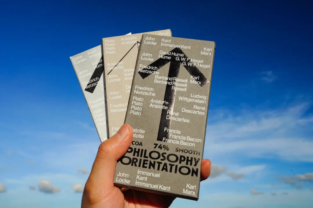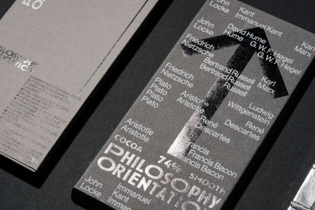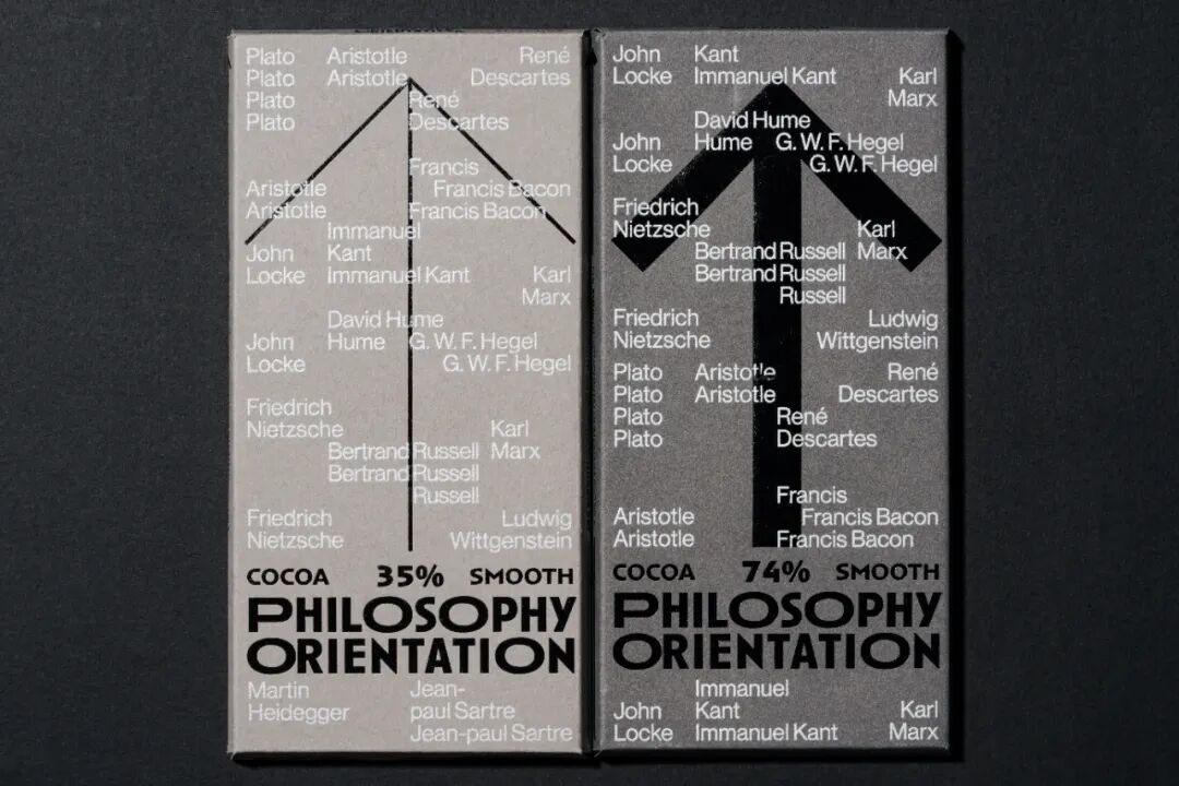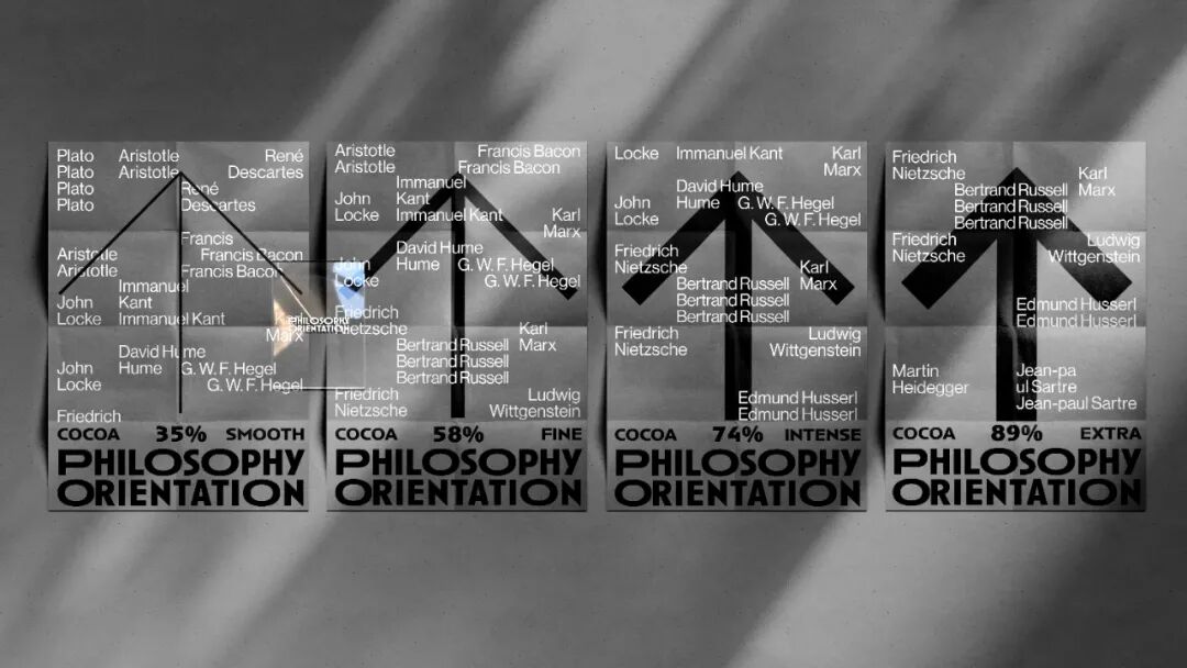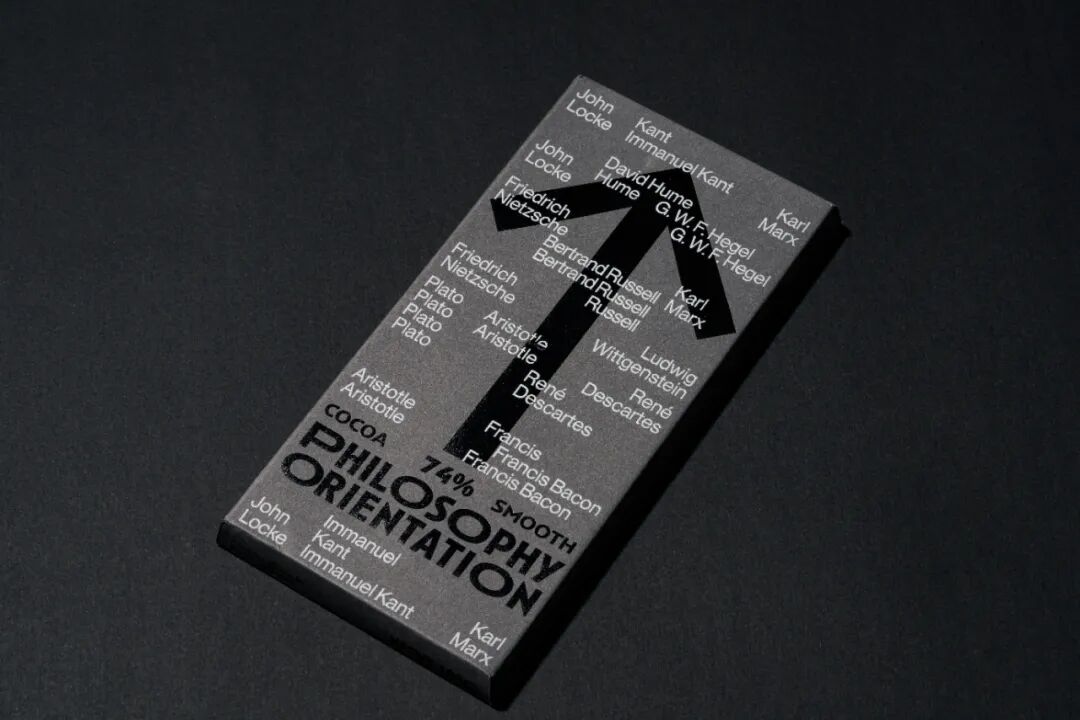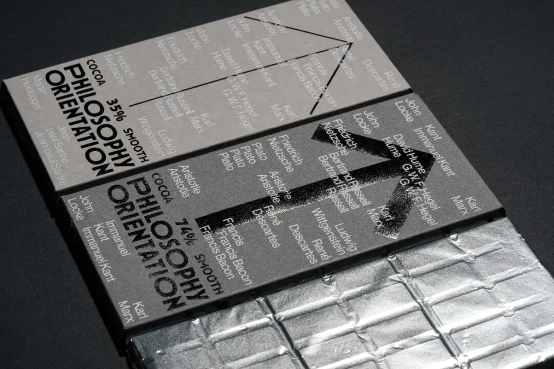 箭头的图形根据可可浓度变化灰度,又寓意在哲学之路上行进的人生,褪去糖衣,回归真实的大人味,在生命旅途中求索真理,苦苦探寻。