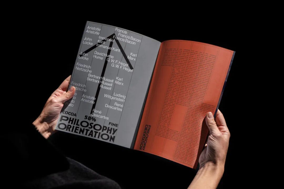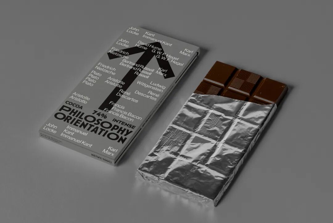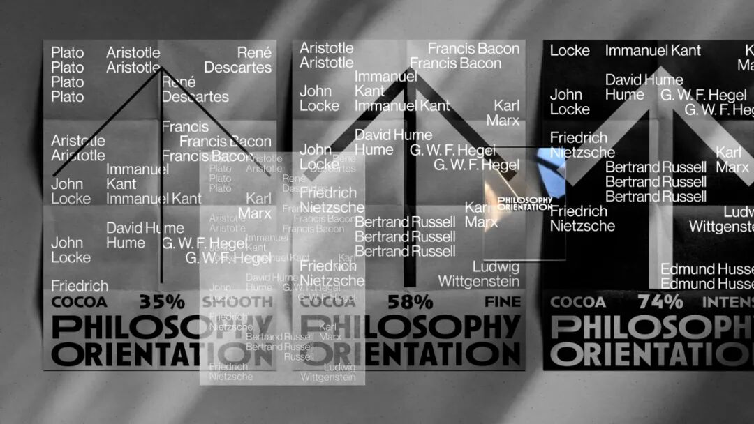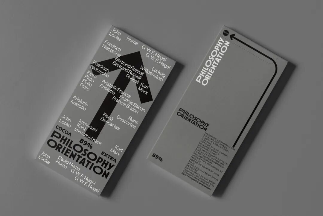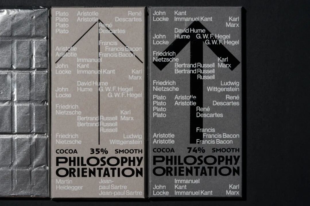 箭头的图形根据可可浓度变化灰度,又寓意在哲学之路上行进的人生,褪去糖衣,回归真实的大人味,在生命旅途中求索真理,苦苦探寻。