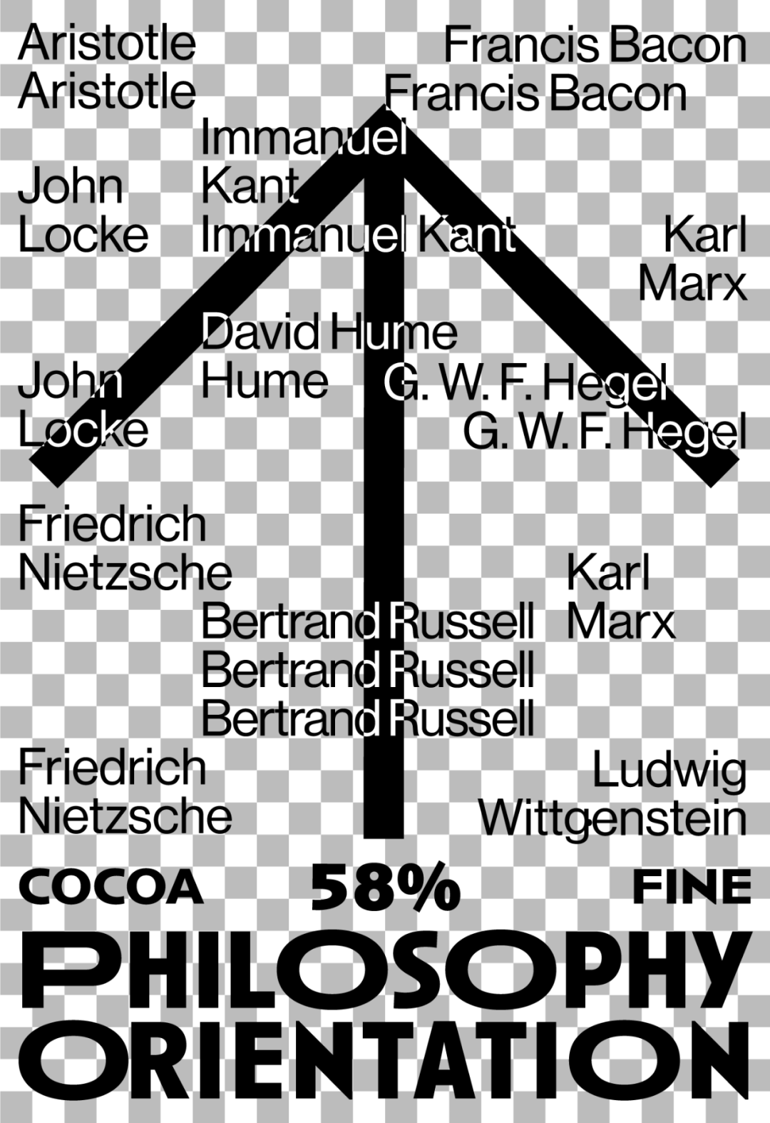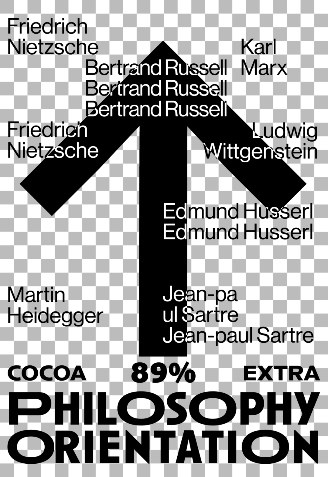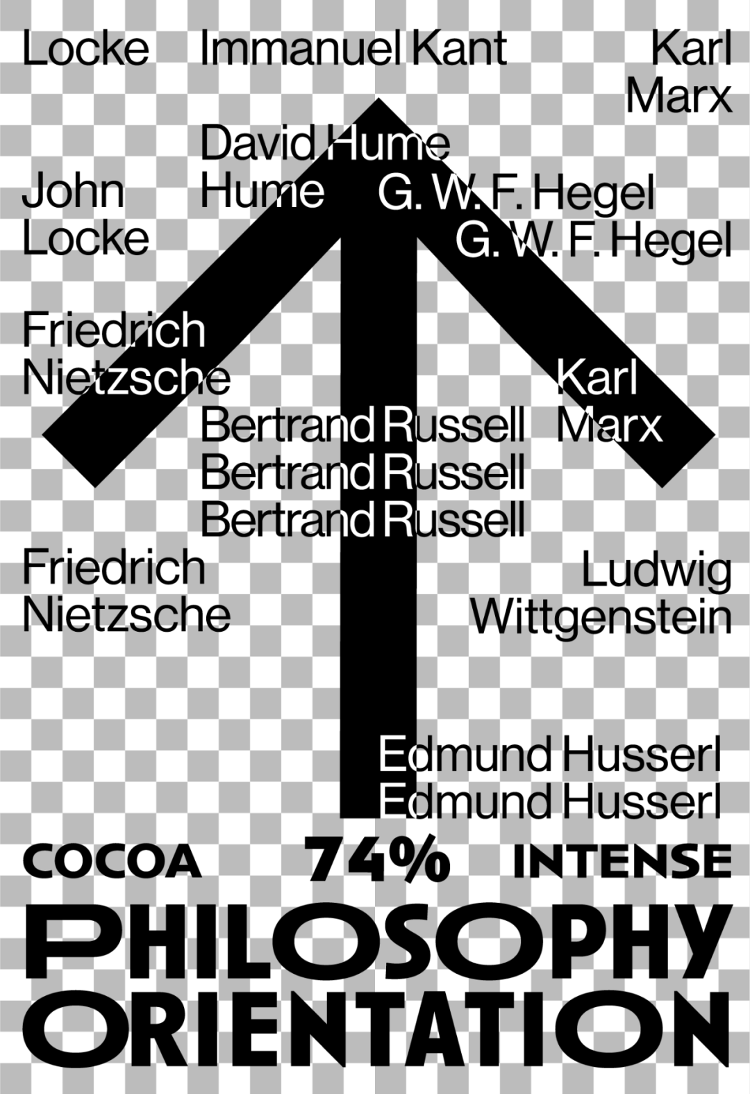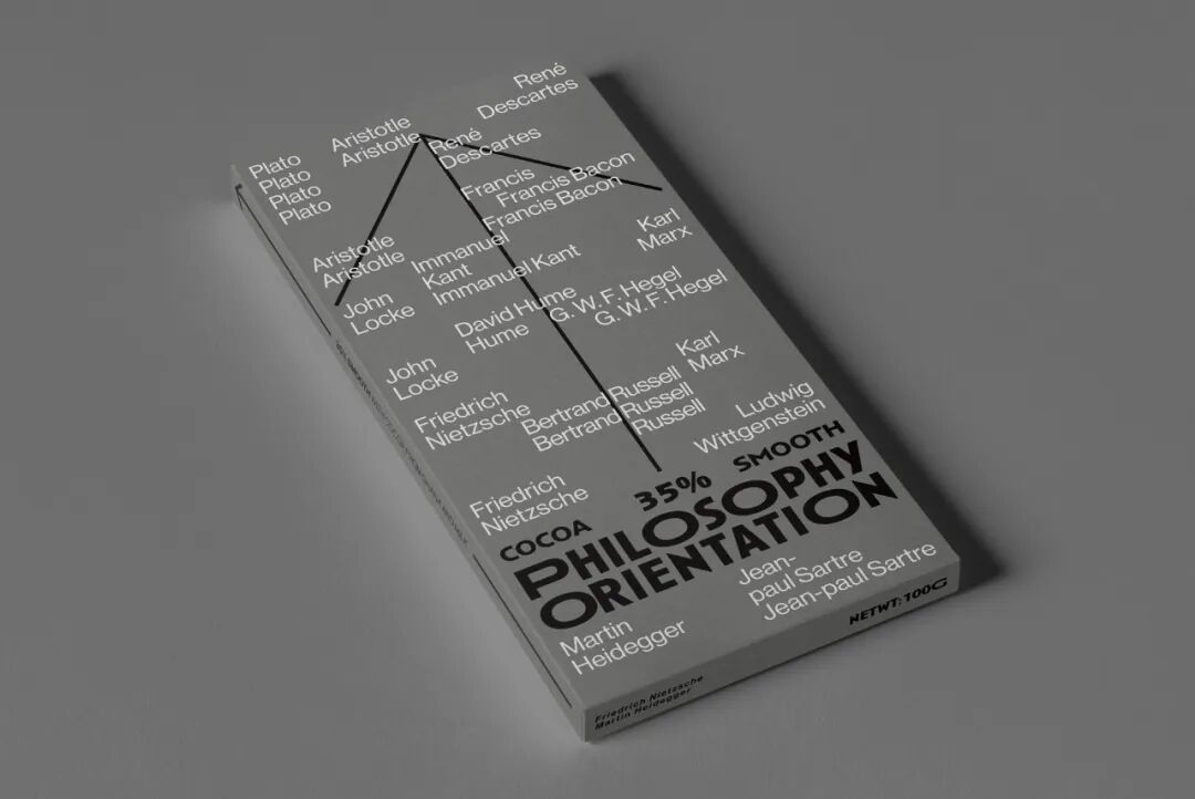 箭头的图形根据可可浓度变化灰度,又寓意在哲学之路上行进的人生,褪去糖衣,回归真实的大人味,在生命旅途中求索真理,苦苦探寻。