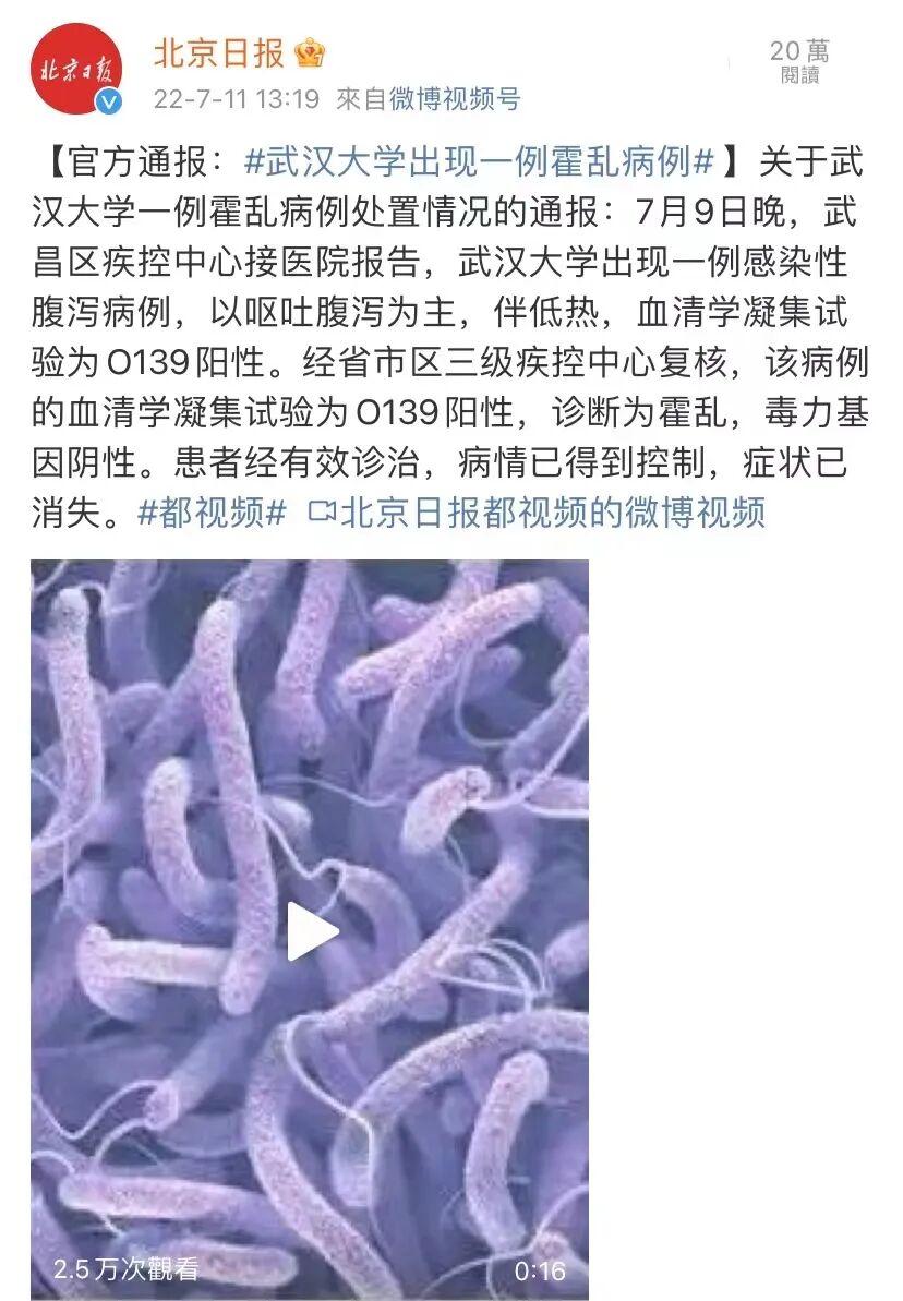 7月9日,武汉市武昌区疾控中心接到医院报告,武汉大学出现一例感染性腹泻病例,以呕吐腹泻为主,伴低热,血清学凝集试验为O139阳性。经省市区三级疾控中心复核,该病例的血清学凝集试验为O139阳性,诊断为霍乱,毒力基因阴性。