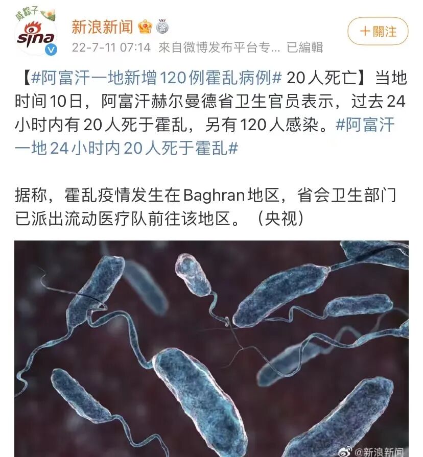 2022年7月10日,阿富汗Baghran地区新增120例霍乱病例,20人死亡。