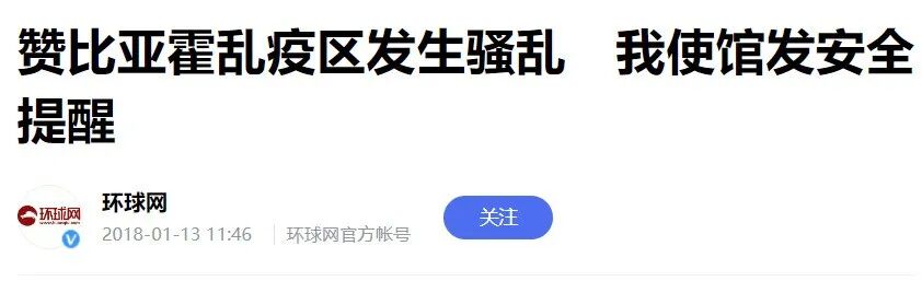 2018年1月14日,赞比亚国内发生严重霍乱疫情,确诊病例达3077例,死亡70例。