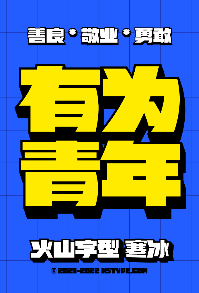 寒冰,它最主要的创意点是通过夸张处理左侧笔画的粗度来达到不常见的陌生感,重心偏右后让每个字符都具有某种视错的韵律。整体超粗的笔画处理,极限压缩字白、字腔、字谷、字距的空间,严密规整。为适应更多的使用场景,制作了曲线、直线和圆角版,呈现出不一样的视觉气质:曲线版刚劲有力的同时又蕴藏着灵动与时尚;直线版更多的是表达出一种积极、进取的精神。圆角版则多了些亲和力。