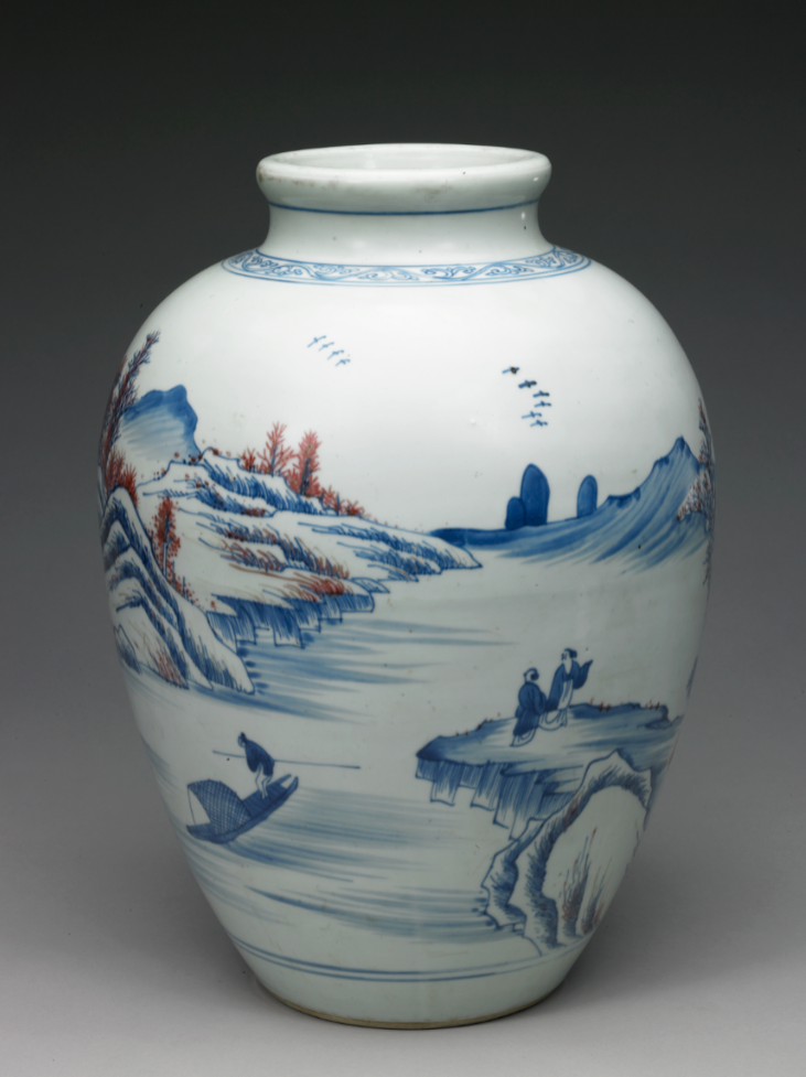 左 清康熙 青花釉里红山水图罐