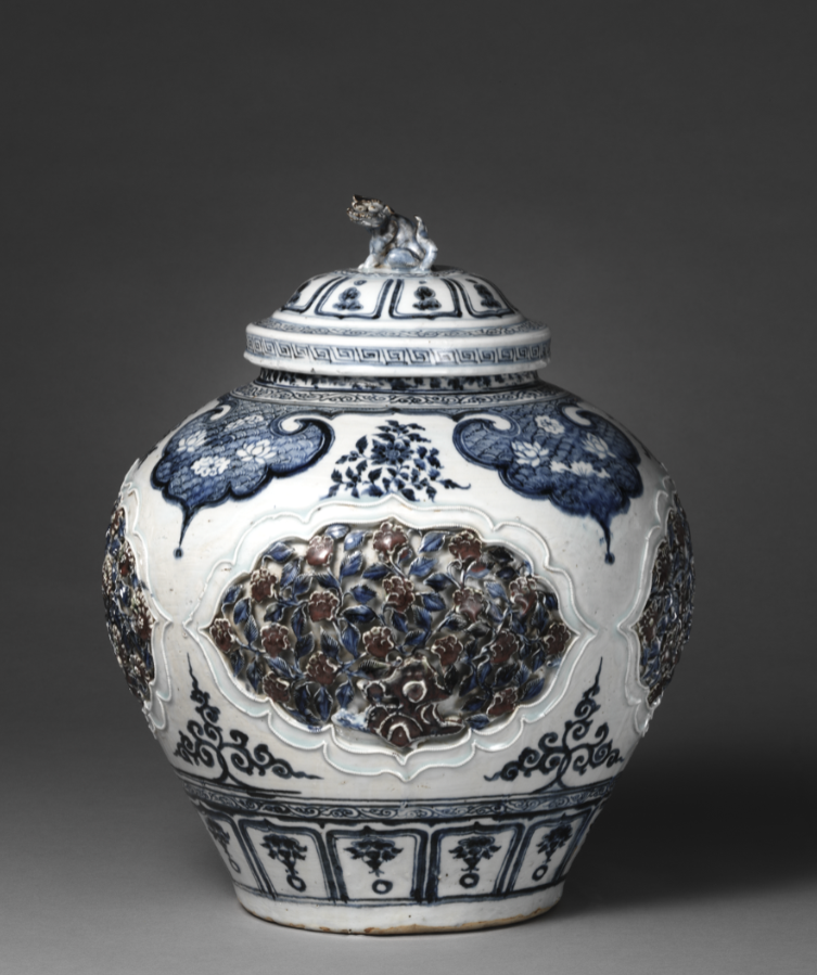 元 青花釉里红开光镂花盖罐