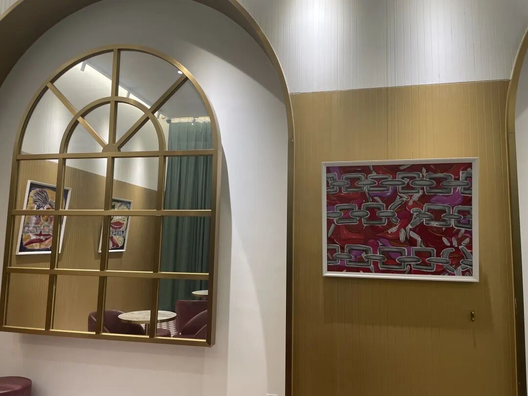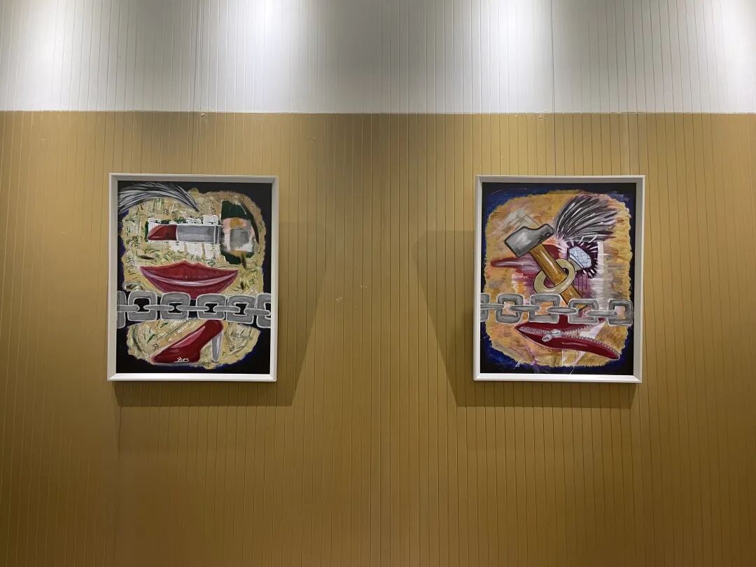 藏品厅中心为Krs 3D咸鱼《未来历险记》1期作品时空使者。展厅中包括艺术家Krs绘画作品从左到右:《神秘星球》《口红,微笑,高跟鞋》《打破锁链》《铁锤与钻戒》与《秋日蒲公英》。