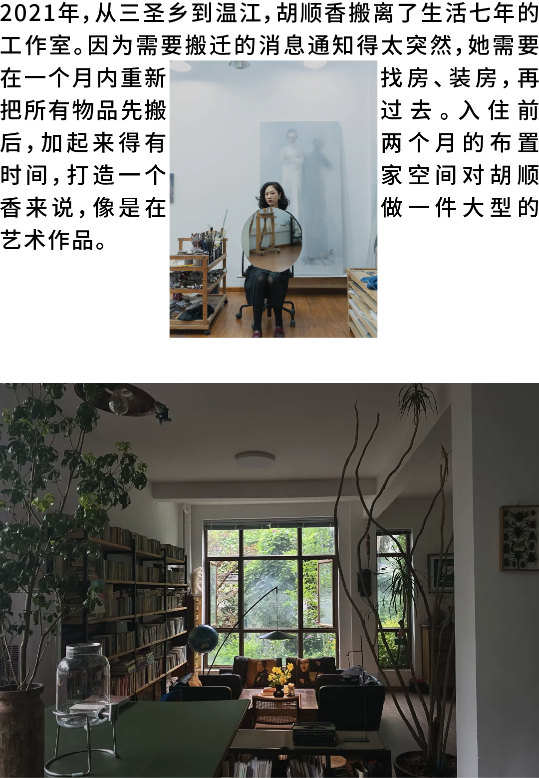 熟悉胡顺香的朋友都喊她“香香”。家既是她的工作室,又是她的日常起居地,包含了私人的审美情趣、新旧交替的家具、自己创作的艺术品、偶然收集回来的怪趣物件、活蹦乱跳的小狗、令人欣喜的植物……这是一个复杂的系统。香香把这次被动迁徙形容为“重新洗牌的机会”,就像是褪掉一层旧的皮肤,露出新的肌理。新的空间不仅刷新了她对很多事物的认知和审美,也让她重新开始审视自己。