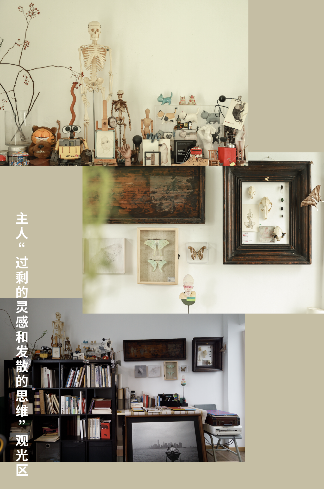 剩下的空间里,就是满满的旧书,和四处淘来的好玩物件,比如飞蛾标本、荒诞不经的关节人偶、骨骼模型,以及各种绘画装置……来回穿梭于不同楼层之间,能触摸到她各个阶段的意识流动,似乎都被定格在这一幕幕微型“剧场”中。