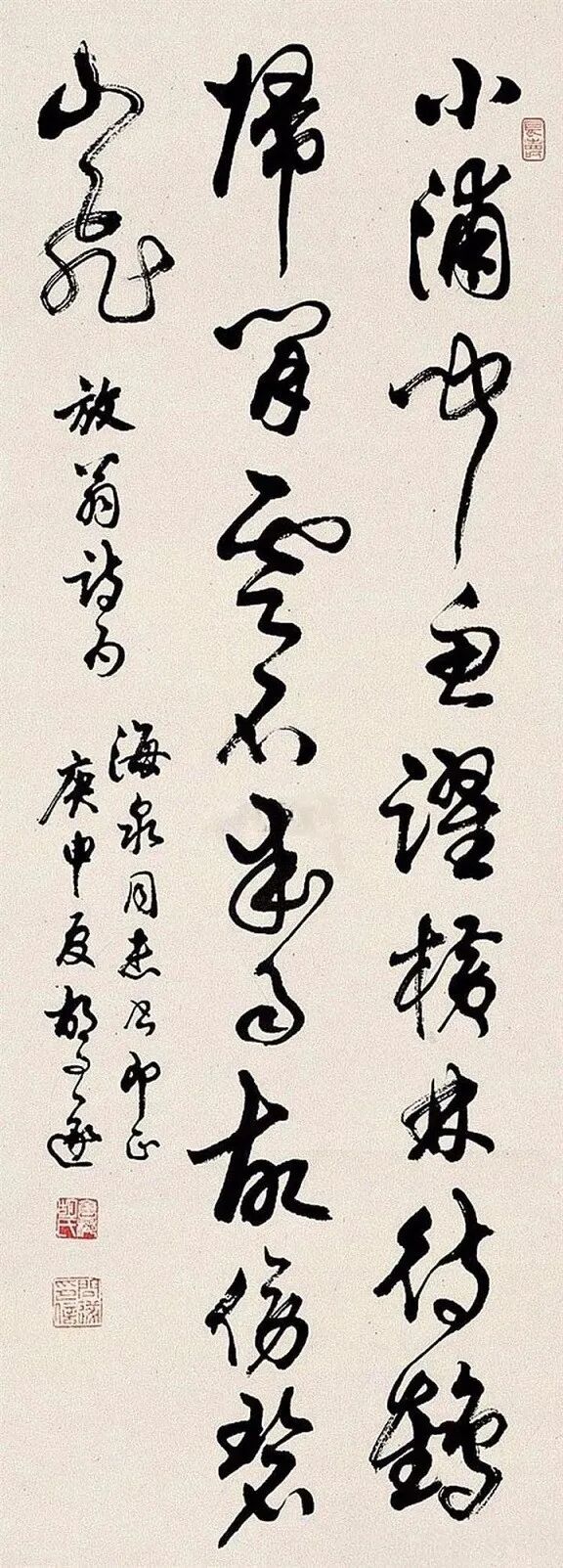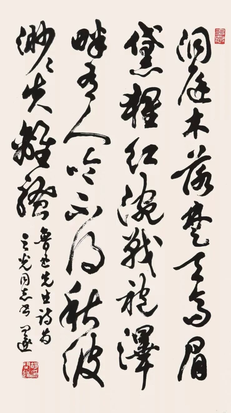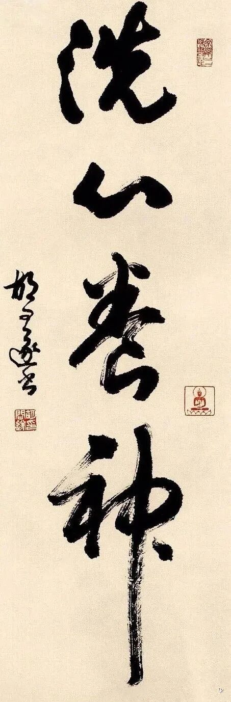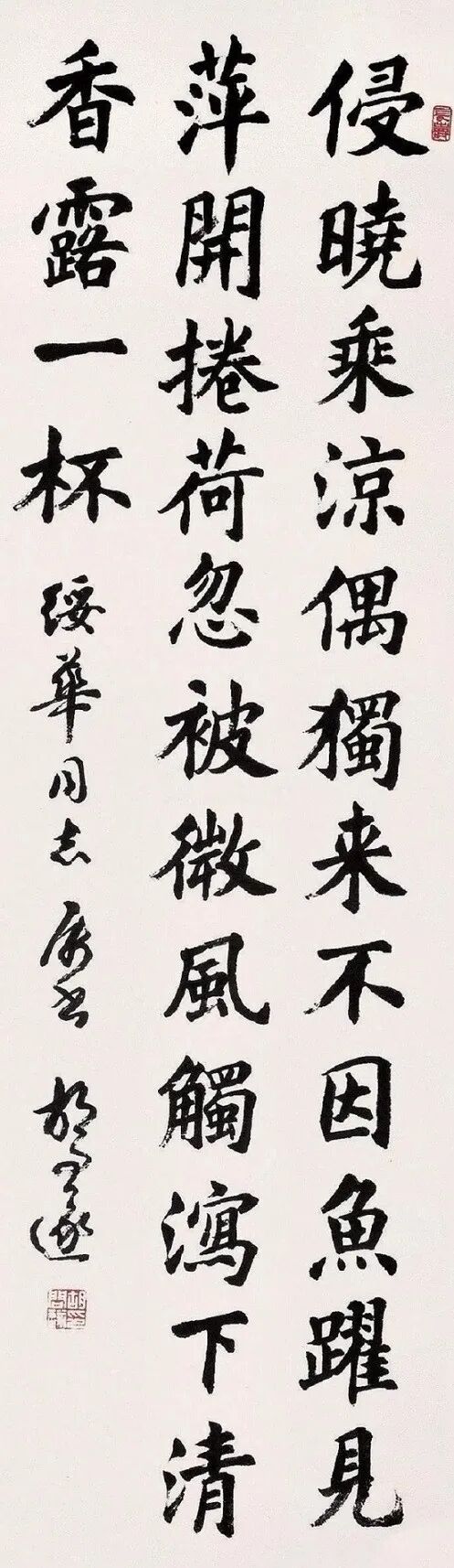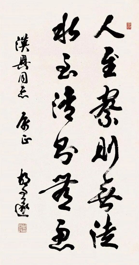 胡问遂早年习柳公权,继颜鲁公,得厚重丰润之精髓。转习褚遂良,得缜密灵动之韵致。后溯“二王”行草,兼及智永、李北海、苏轼、黄庭坚、米芾、蔡襄等,融会贯通,数十年而不懈。其书法浑厚凝重,洒脱灵动,气韵高雅,意态从容。