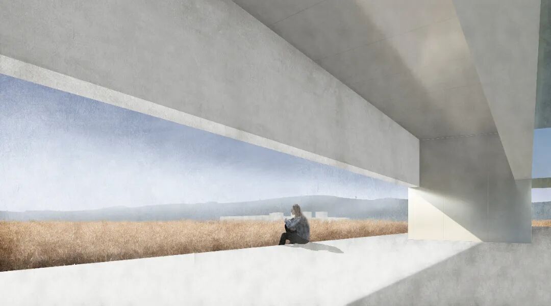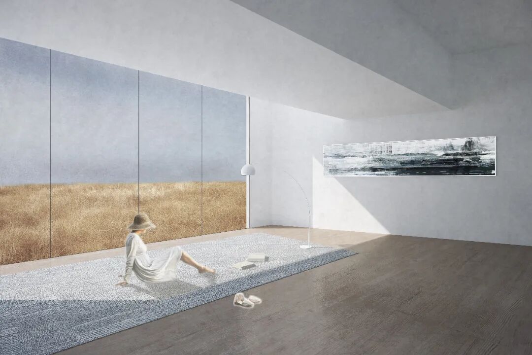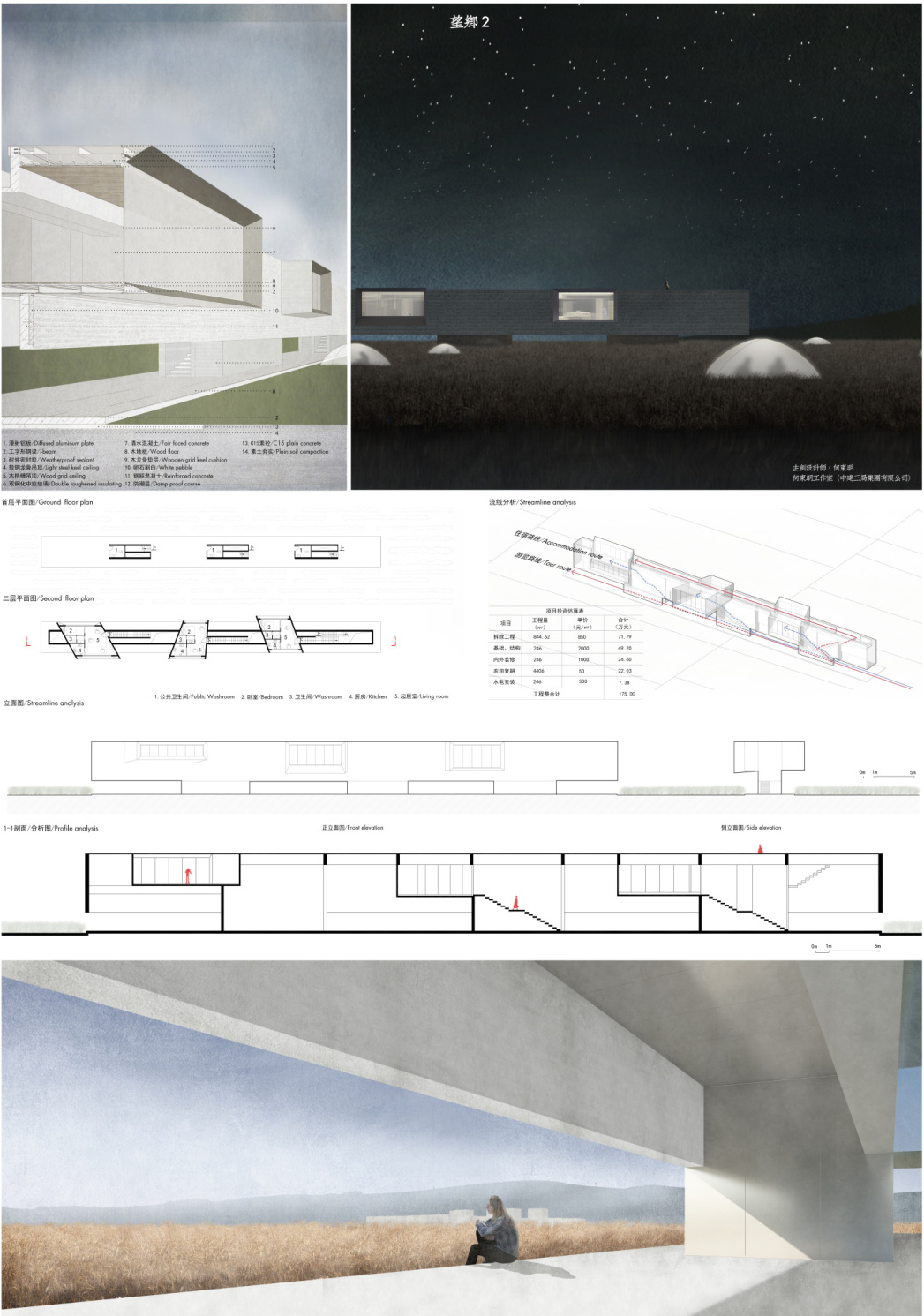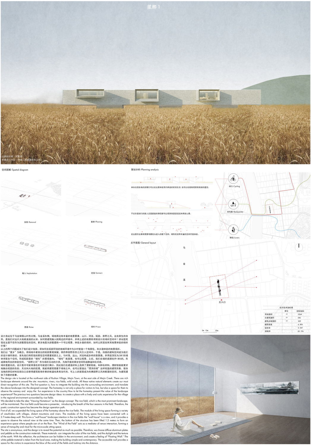 设计选址位于马金镇儒山村西北侧,马金溪东侧,场地周边有丰富的地景要素:山川、河流、稻田、原野之风,这些原生的自然,是我们对这片大地最直接的认知。如何使建筑融入到周边的环境中,并将上述的地景转译到设计的场所空间中?驿站型民宿在这里不仅作为游客居住的空间,更多地是为游客提供一个可以观景、体验乡趣的场所。如何让民宿发挥其地景体验的场所价值?设计以“望乡”为概念,将场地中最突出的稻田景观保留,将四季田野息息之风引入空间中。于是,诗意的建构空间成为我们的设计操作路径。首先我们将民宿的居住空间悬置稻田之上,与村落,远山,河流构成多样的取景器,并用进深仅为2米7的墙体串联各个空间,形成稻田里的“墙宅”的景观意向,“墙宅”既是景,也可以观景。之后,我们在墙的底部抬升1米5的,形成席地而坐的体验空间,“田野之风”作为场所互动的介质,为微尺度的席坐空间形成静谧和仪式感。场所是匿名的,设计是尽可能将潜在的可能进行揭示。因此我们在建造材料上选择了漫射铝板和卵石材料,漫射铝板能更好地融合稻田的色彩、天光和大地的肌理,既能将建筑隐匿于场地之中,也可以营造出“漂浮的墙”这样轻盈的建筑形象。取自当地的卵石材料在刷白之后使得建筑既有朴素的味道也具有当代性。可上人的屋面成为吹拂田野之风和眺望的空间,为游客提供诗意的体验。