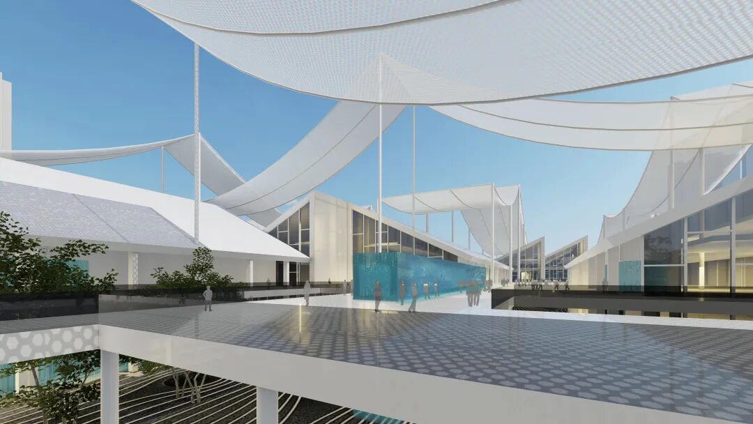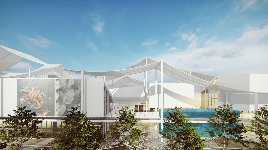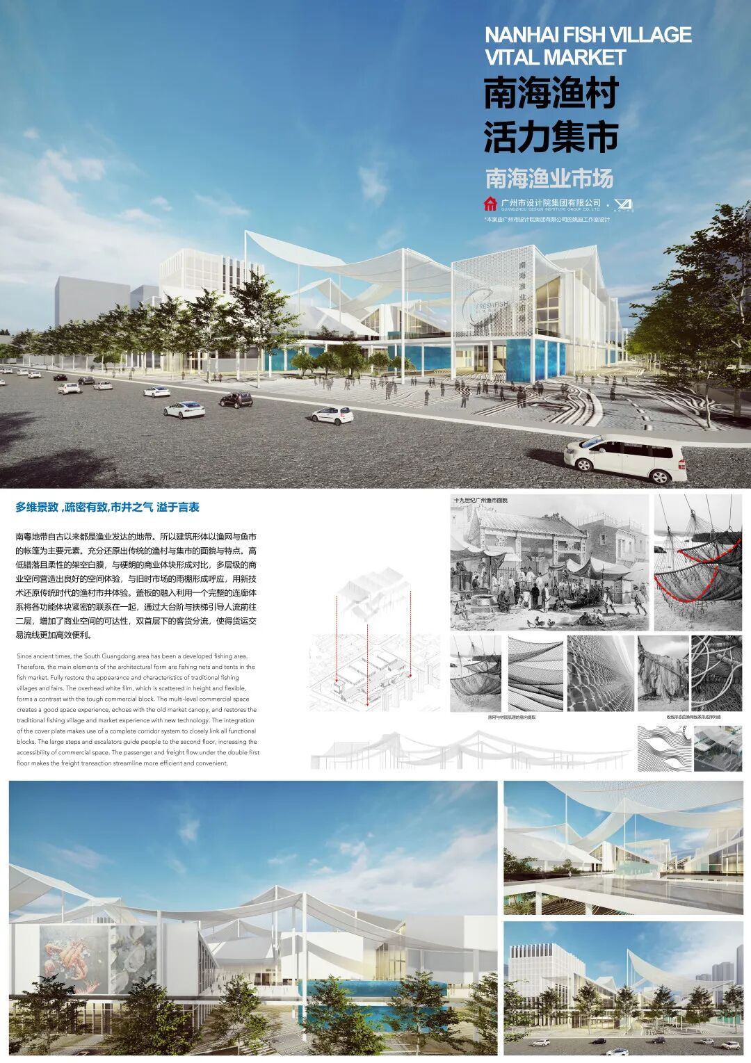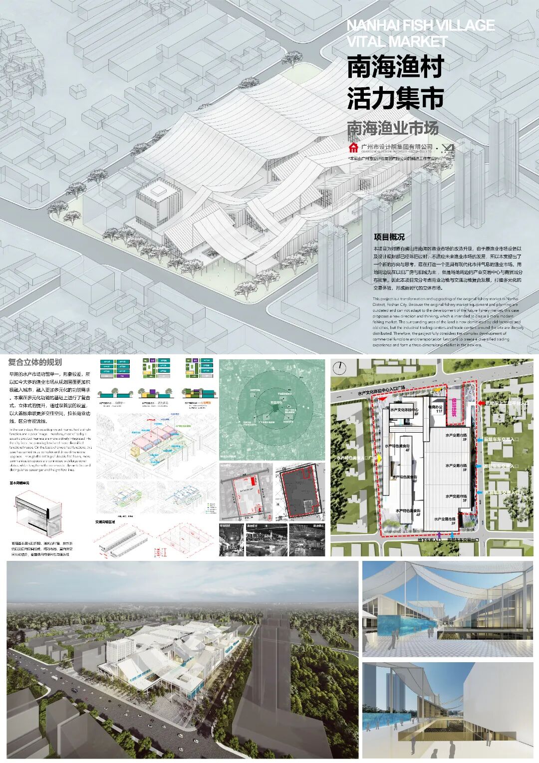 本项目为对原有佛山市南海区渔业市场的改造升级,由于原渔业市场设备以及设计规划都已经陈旧过时,不适应未来渔业市场的发展,所以本案提出了一个新的方向与思考,意在打造一个更具有现代化市井气息的渔业市场。用地周边现在以旧厂房与旧城为主 ,但是场地周边的产业交易中心与商贸城分布密集,因此本项目充分考虑商业功能与交通功能复合发展,打造多元化的交易体验,形成新时代的立体市场。而南粤地带自古以来都是渔业发达的地带。所以建筑形体以渔网与鱼市的帐篷为主要元素。充分还原出传统的渔村与集市的面貌与特点。高低错落且柔性的架空白膜,与硬朗的商业体块形成对比,多层级的商业空间营造出良好的空间体验,与旧时市场的雨棚形成呼应,用新技术还原传统时代的渔村市井体验。盖板的融入利用一个完整的连廊体系将各功能体块紧密的联系在一起,通过大台阶与扶梯引导人流前往二层,增加了商业空间的可达性,双首层下的客货分流,使得货运交易流线更加高效便利。