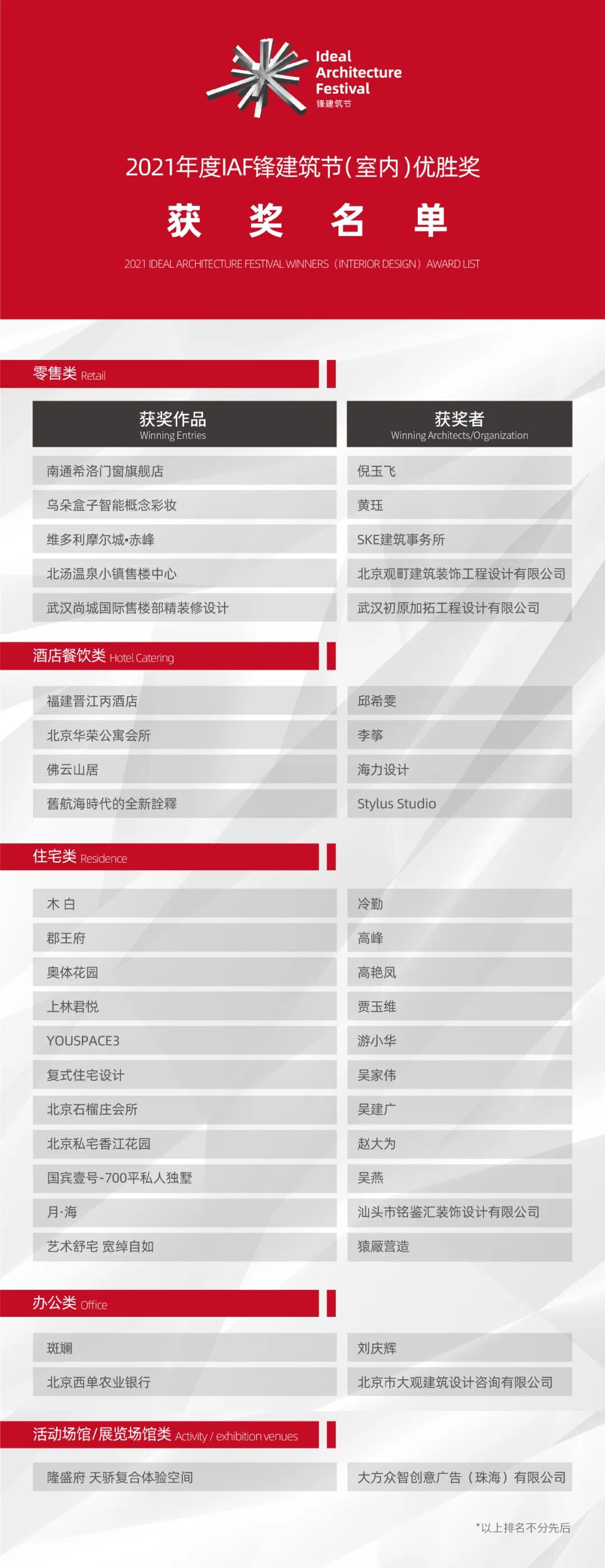 自“2021IAF锋建筑节”于2021年4月启动,伴随着全国4场IAF锋建筑节年度思想论坛的宣传推广,共征集来自全球范围内参评作品1189套,IAF锋建筑节评审委员会依据评审标准层层选拔, 现已完成赛事初评。最终共169套设计作品脱颖而出,荣膺“2021IAF锋建筑节(建筑)优胜奖”、“2021IAF锋建筑节(室内)优胜奖”的殊荣!(以下作品排序不分先后)