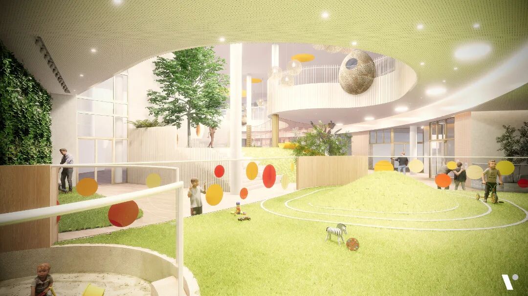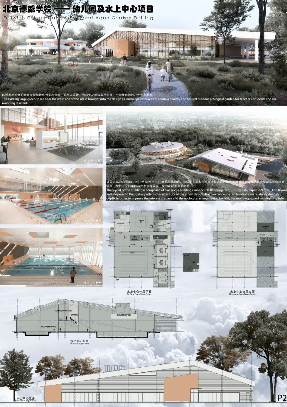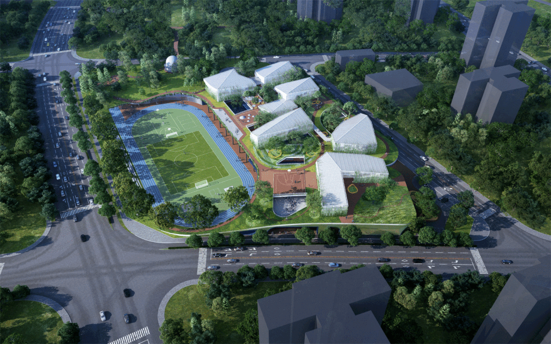 项目结合地块形态,规划布局幼儿园(独立使用)及水上中心两大功能(临近的初高中及本地 块幼儿园共同使用),有机组织上下学/人车/后勤流线,幼儿园教学楼与水上中心两栋建筑相对独 立又联系便捷。