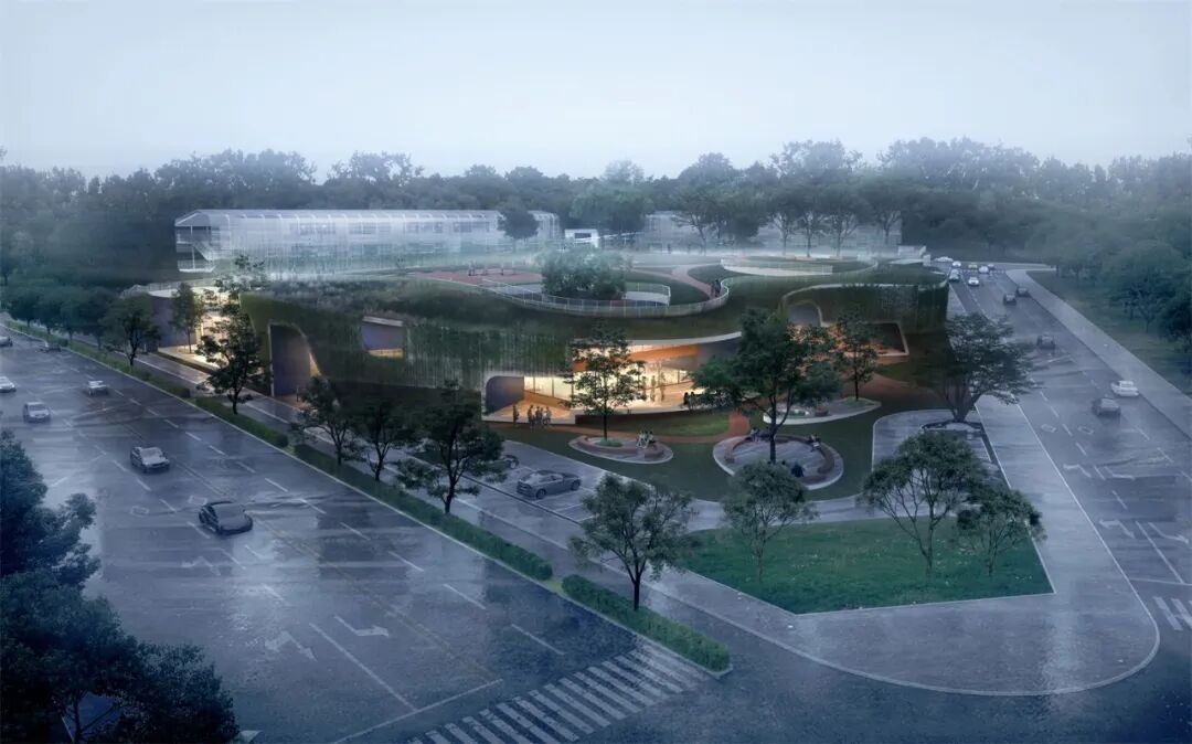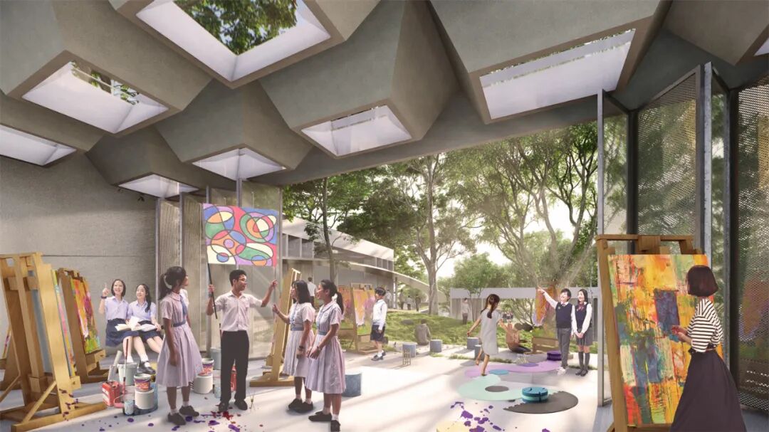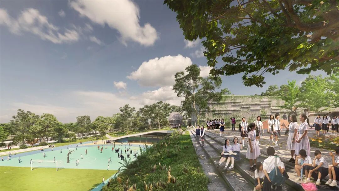 “人工山体”上部分成两个部分。普通教室,采用低矮、横向伸展体量将上部围合出不同的区域,外立面采用银灰色金属网与绿色爬藤植物等被动式节能手段。艺术教室,散落在自然山体周围,利用室内外可延伸的方式,创造与自然融合的课堂。校园从自然中出现,并重塑自然,形成一个融合校园与社区的公园。
