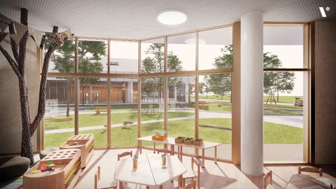 通过建筑外部形态,内部构造的设计,绿色环保材料的使用与景观环境的布置,达到整个项目的 绿色、节能、和谐的目的。夕卜立面元素现代简洁,内部空间丰富活泼,内夕卜元素协调统一,室外 活动场地开阔自然且充满野趣。
