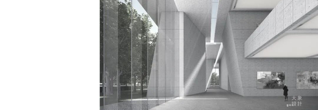 艺术馆入口的左侧是他的工作室区域,右侧是展厅区域,两者之间是庭院的公共空间。艺术馆由底块所支撑的屋顶,在更抽象的意义上影射了他关于荷花的一种想象,使得整个体块之间变得更加灵活。