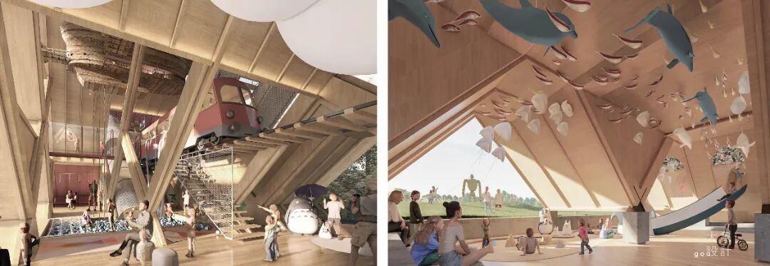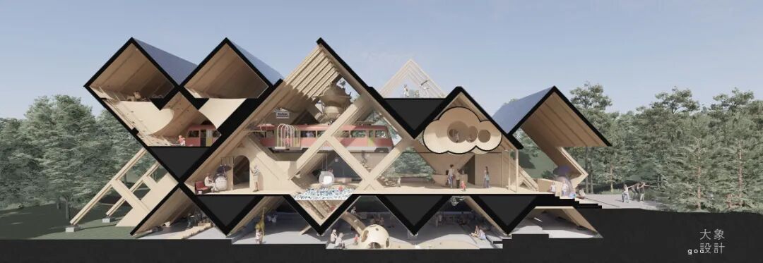 从林间望去,未来城亲子活动中心是一个菱形架构的空间,有点像是玩具搭建起来的建造形象,但有着非常丰富的内部空间。外部整个木构结构是非常清晰的,内部的设计是为了让孩子感受到更多的童趣,能够兴奋地玩耍,有攀爬的场景也有底层空间的活动利用。