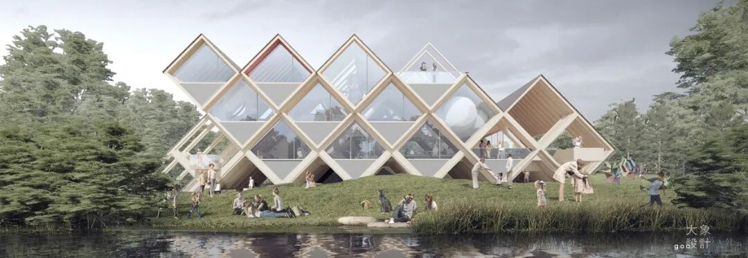 在菱形的木构建筑当中有一个坡道,我们利用其中的高差去设置不同层次入口,这能够非常好地与场地相契合。同时整个未来城亲子活动中心建筑是位于水边,保留大片的阳光能够照射到的草地,让孩子、大人、游客能够在这里玩耍。