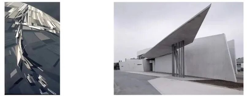 左图是著名女建筑师扎哈·哈迪德(Zaha Hadid)早先在很多建筑竞赛当中所描述的抽象且具有张力的画面,在这之中包含了她对于建筑的想象。右图的德国Weil am Rhein的维特拉消防站,是她建成的第一栋建筑,从中可以看到,她最初“未建成”的创作理想和最终的建成作品之间有着密切的联系。