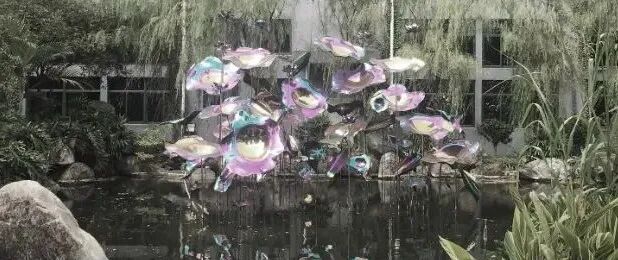 这是他的以钛合金为材料创作的前哨荷花,在池塘的自然景观当中,以一个金属材料去模仿真实的荷花,给予人一种新鲜陌生感。