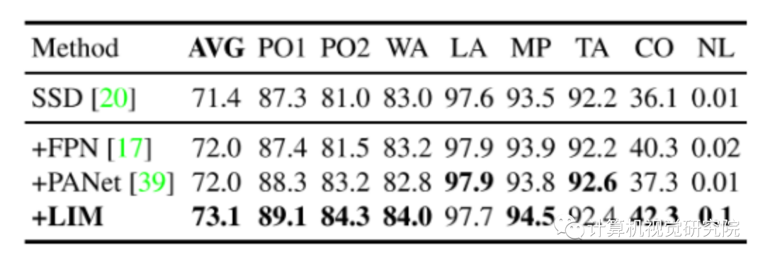 同时,由于双向传播架构是一种具有密集连接机制并且对特定的特征进行了增强的特征金字塔机制,因此作者选择了SSD为基础模型(因为SSD模型中不包含特征金字塔结构),将侧抑制机制同经典的特征金字塔机制FPN和双向的PANet机制进行了比较。实验结果如下表所示。