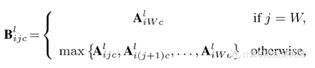 对于双向传播架构左侧的自上而下的密集路径而言,它从更高级别金字塔上采样空间较粗但语义较强的特征地图,能够表征更高分辨率的特征。在卷积层中通过侧向连接的过程中,这些特征图得到增强。每个侧向连接融合了来自卷积层和自上而下路径的相同空间大小的特征图。低卷积层的特征图语义层次较低,但由于次采样次数较少,其激活定位更加准确。进一步的,作者构建了密集的连接,以确保滤波的效果最好,公式如下:
