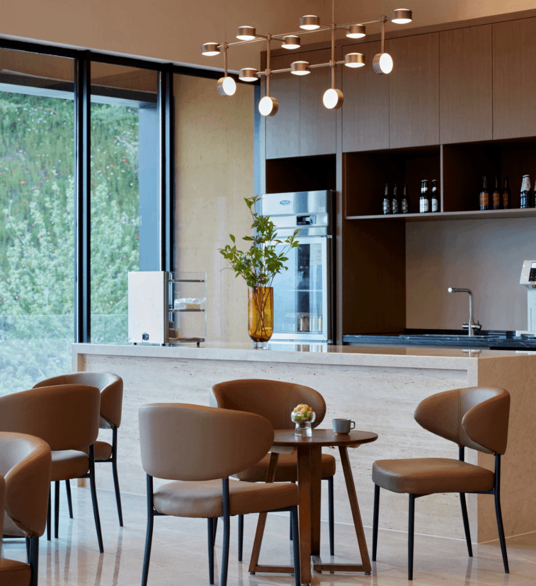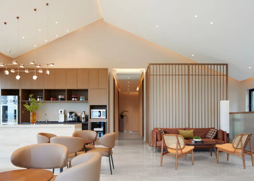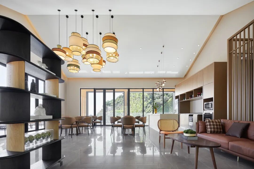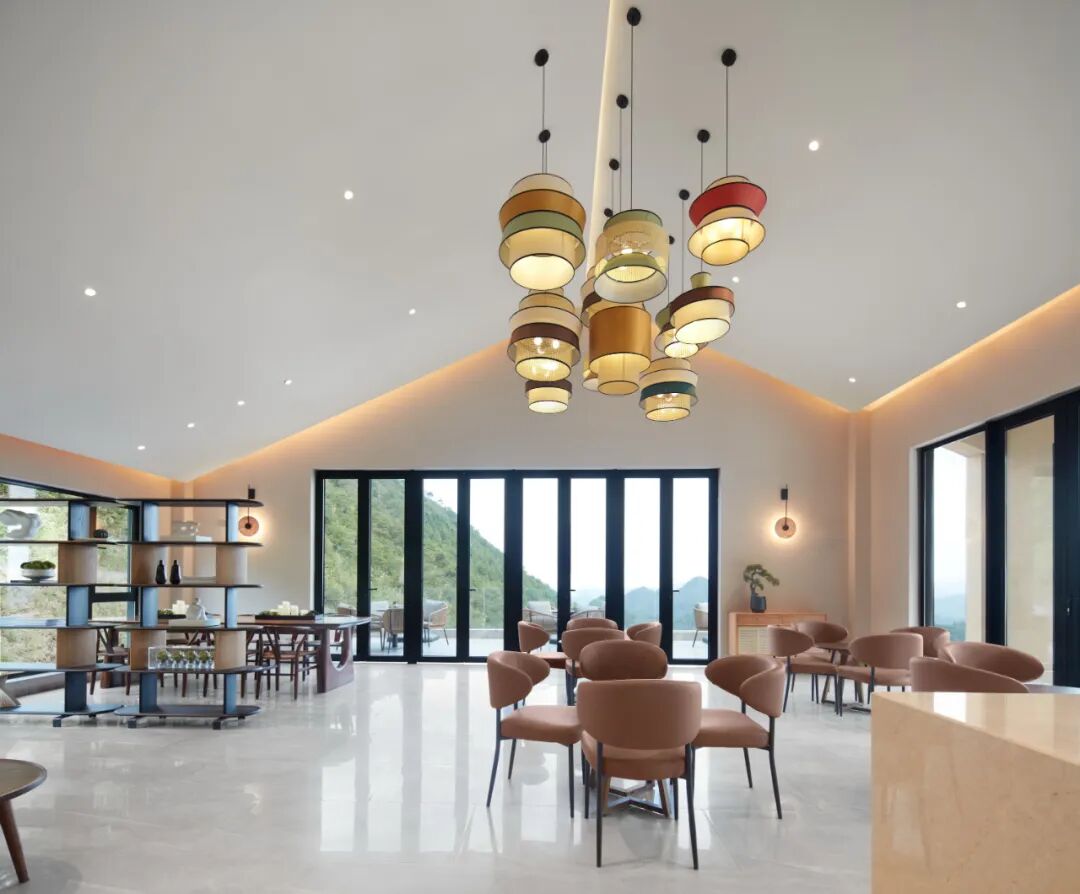 云顶精品民宿之桃坞塔餐厅,集咖啡吧、日料、中餐一体的综合性餐厅,结合 Japandi 的质朴优雅,独具新意。以山为启,传承地域文化的元素,隐于原野。设计中使用了大量的硅藻泥,与自然连接,让宾客享受美食的同时,感知风光秀丽的山水画卷。
