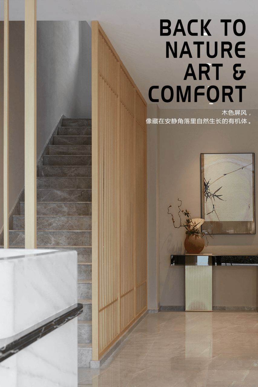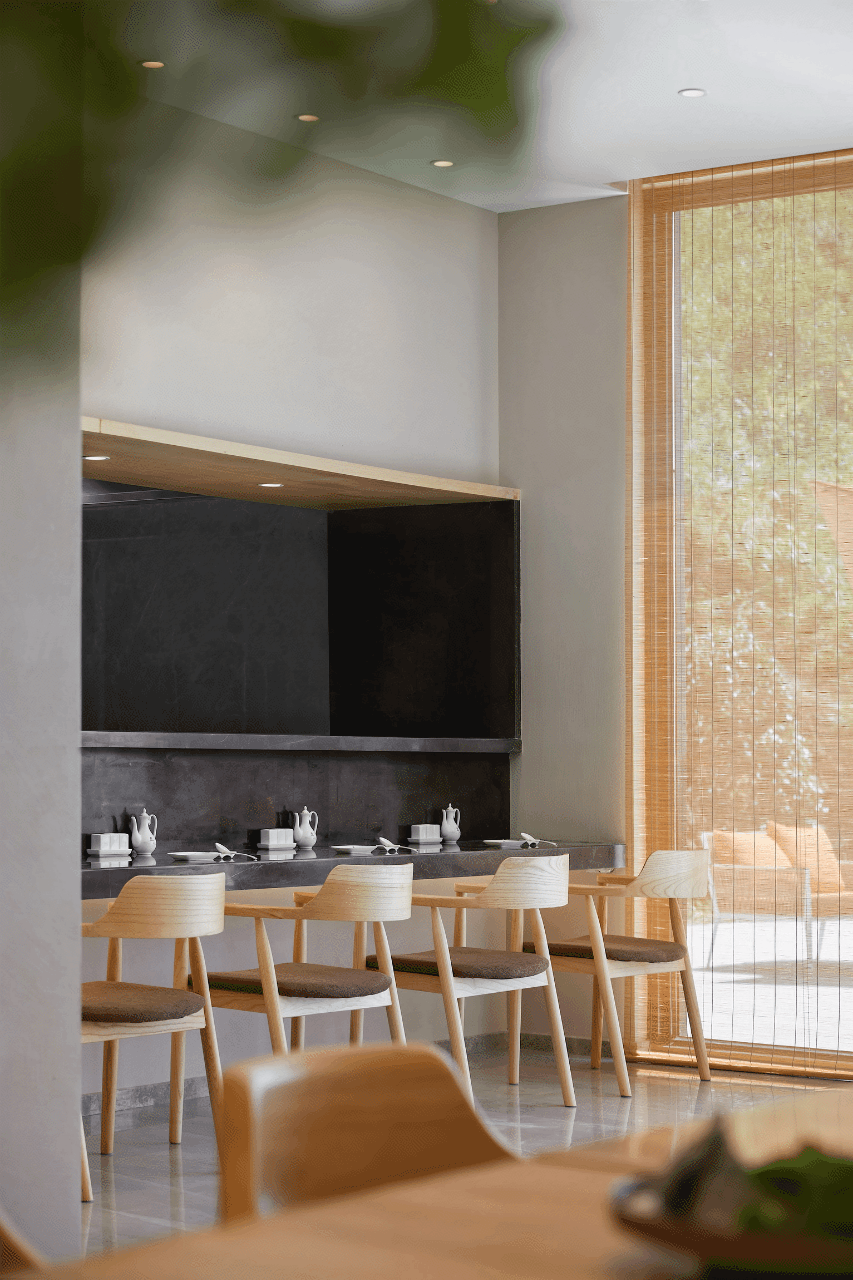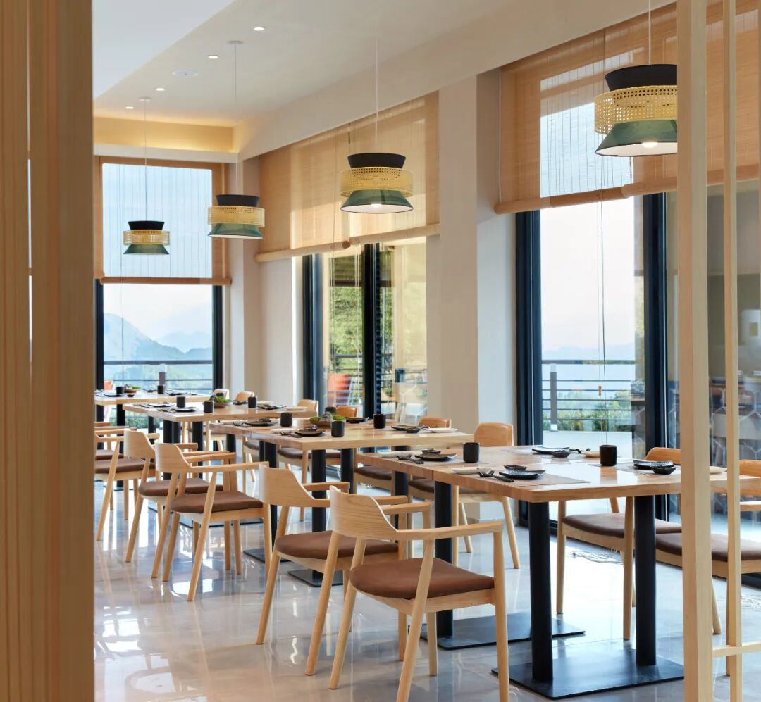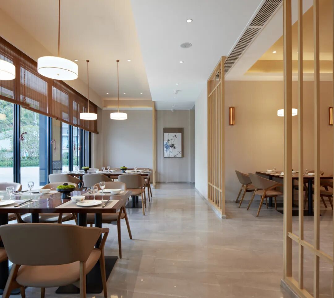 中餐区,整体木色采用中色木,屏风设计融入日料的风格元素,中式和日式风格完美融合,用餐区竹帘、木材等天然材料,质朴自然,古今交织,整体氛围表现出中式的庄重和优雅,同时点缀着日式的闲适温和。