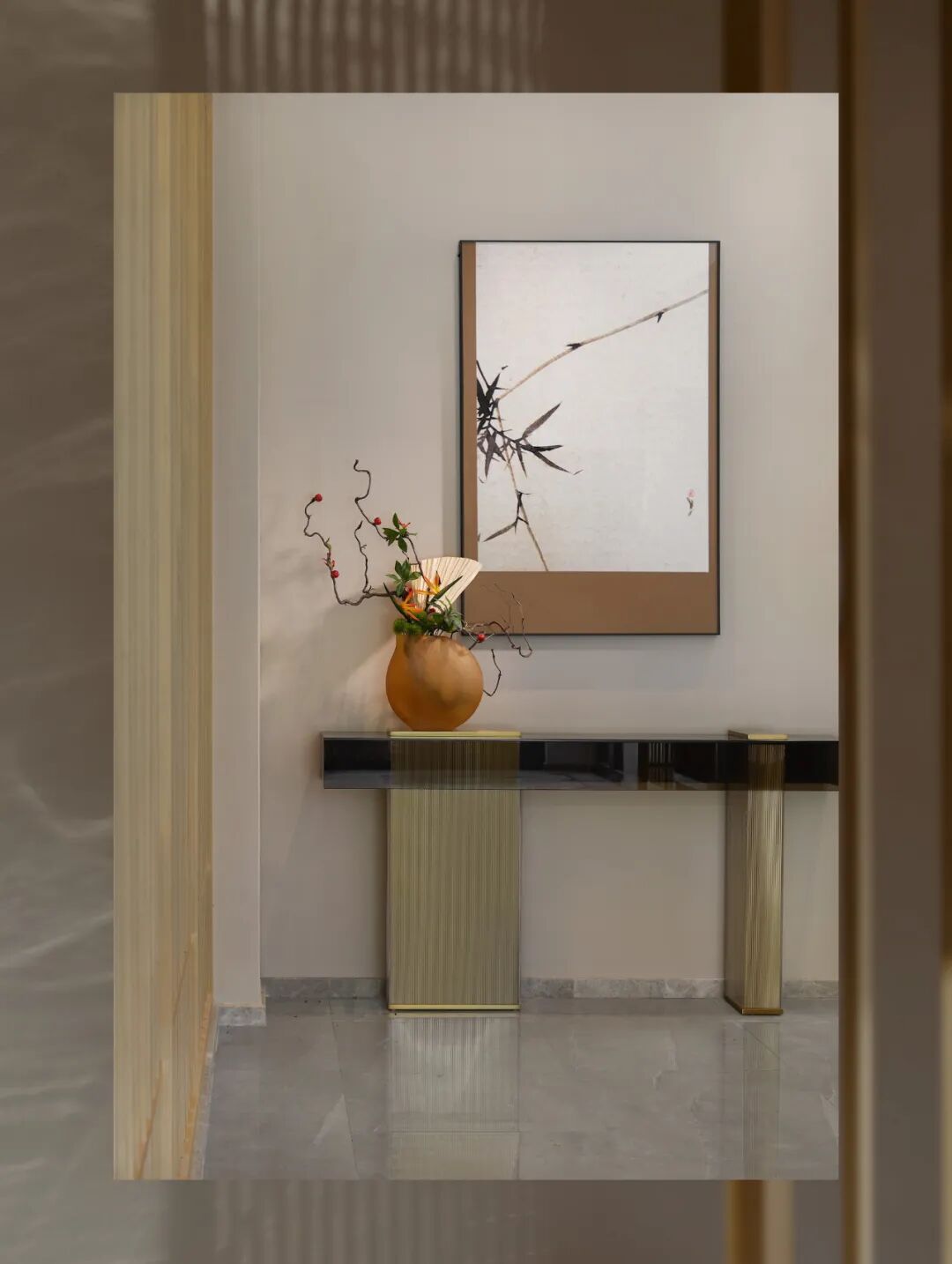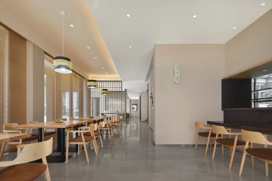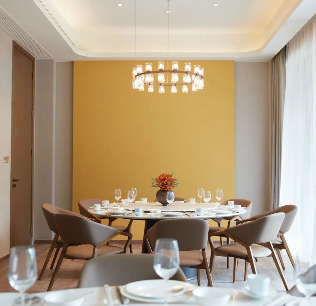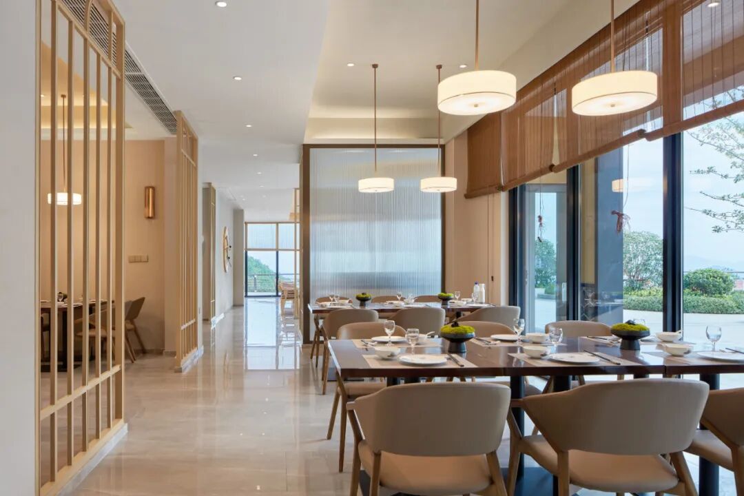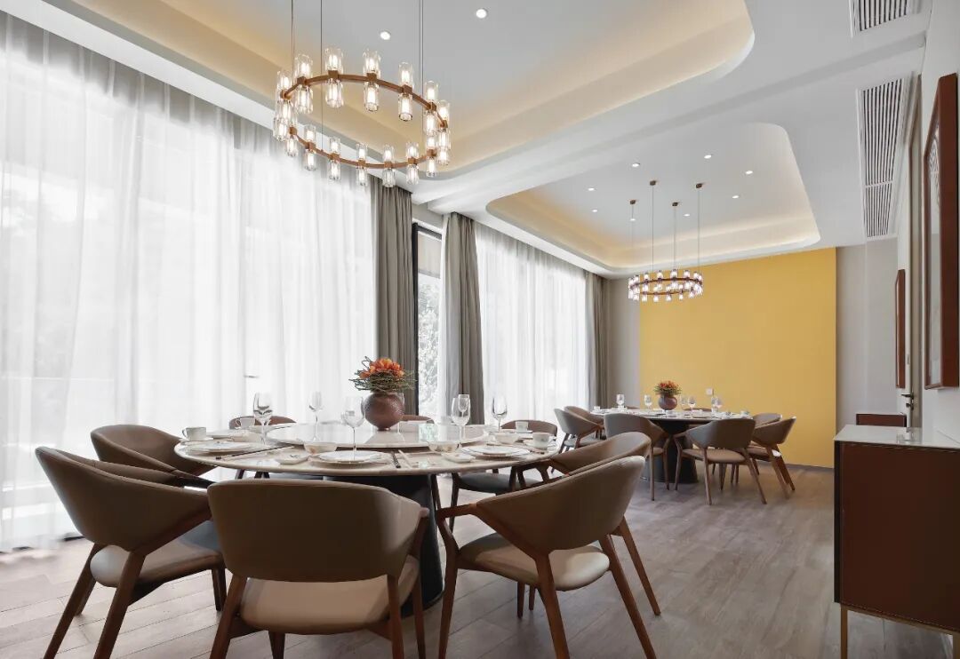 包房区,延伸一楼的中式风格,特为宾客打造的独立饮食空间。空间延伸了外建筑的色彩以大地色为基调,并以当地泥土色彩咖橙色作为跳色,融合具有东方陶瓷文化的软装配饰,沉稳儒雅。低调的色彩,天然的绿植和午后挥洒的阳光,在谈笑和美食中感受生活的温度,亦是所追求的休闲度假的意义。