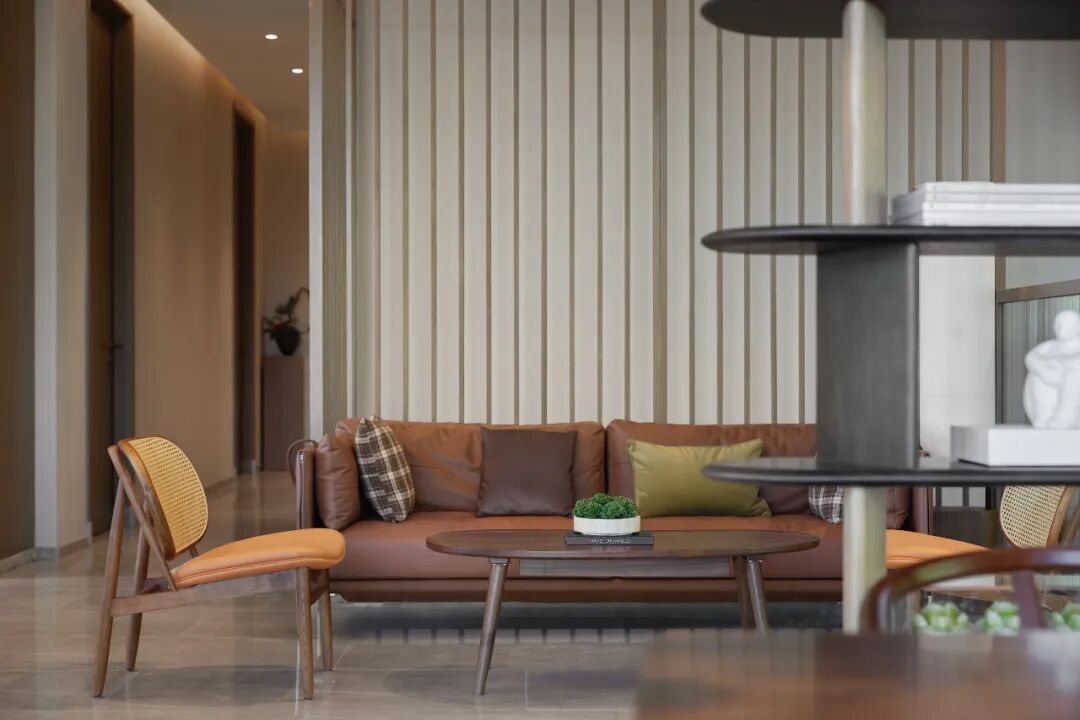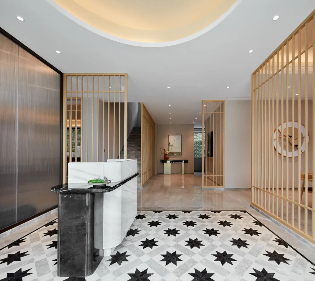 前台接待区,主背景运用现代材质工艺,以波纹玻璃透出的朦胧美,同时与日式的原木色屏风完美的结合,配上地面“米”字特殊地砖,让这个空间就像藏在安静角落里自然生长的“有机体”。大地色硅藻泥的大面积使用,并应用于不同大小和功能的矩形结构中,让温和的空间富有无穷的变化和特色。