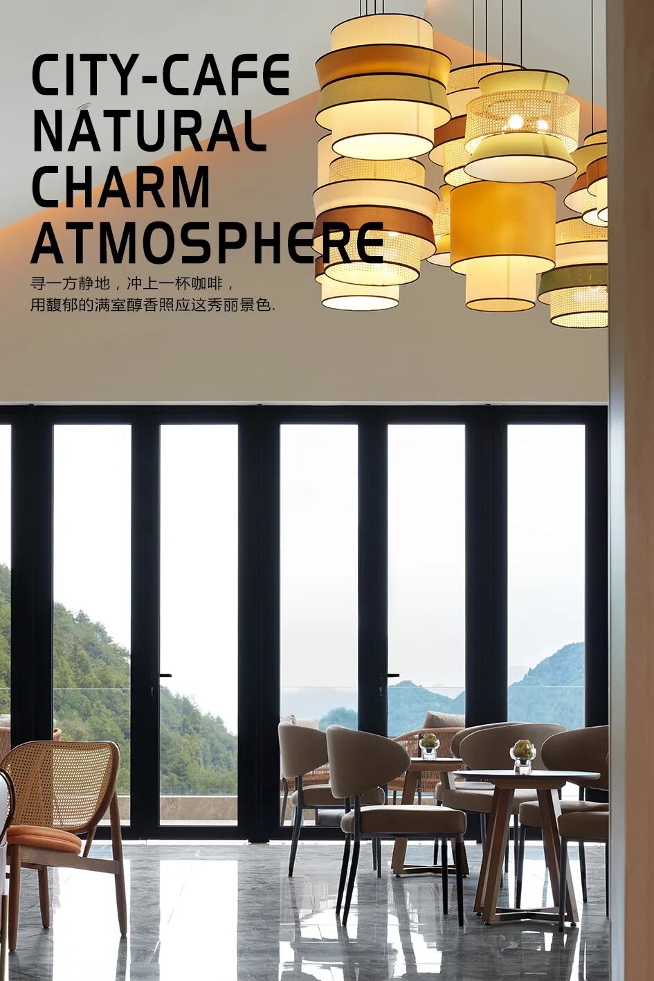 茶咖休闲吧,“寻一方静地,冲上一杯咖啡,用馥郁的满室醇香照应这秀丽景色”,以此营造出“都市咖啡吧”的氛围。整体家具以咖色为主搭配日落橙、土黄色、绿色;同时在艺术陈设了植物类的器物摆件:波点南瓜、多肉类绿植,以及多彩组合吊灯等艺术化演绎,让趣味性流淌在空间的每一处,配合超过5米的建筑层高和三面落地玻璃隔断的设计,让阳光和景色尽收眼底。