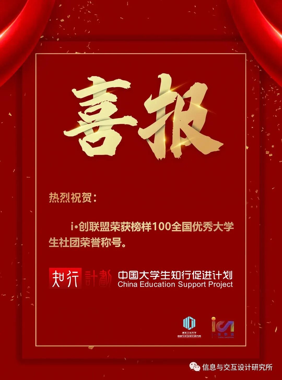 2022年1月6日中国大学生知行促进计划发布的2021年榜样100全国大学生社团获奖名单中“i·创联盟”被评为全国优秀大学生社团!中国大学生知行促进计划于2012年正式设立,致力于汇聚和推动社会资源,支持大学生成长发展。2021年,在疫情反复和雨涝灾害的不利影响下,知行计划继续组织开展了包括生态文明、环境保护、非物质文化遗产保护、乡村振兴、助学支教、实习就业、创新创业、专业竞赛、云支教在内的十余项大学生成长发展和志愿服务项目。共有来自北京大学、清华大学、复旦大学、上海交通大学、浙江大学、同济大学、武汉大学等290余所高校的2,300多支大学生团队申报知行计划项目,直接资助130余所高校580多支团队的1.9万名大学生,开展960余场线下活动,发布近万条线上传播内容,收获980余万阅读互动,影响千万名大学生。