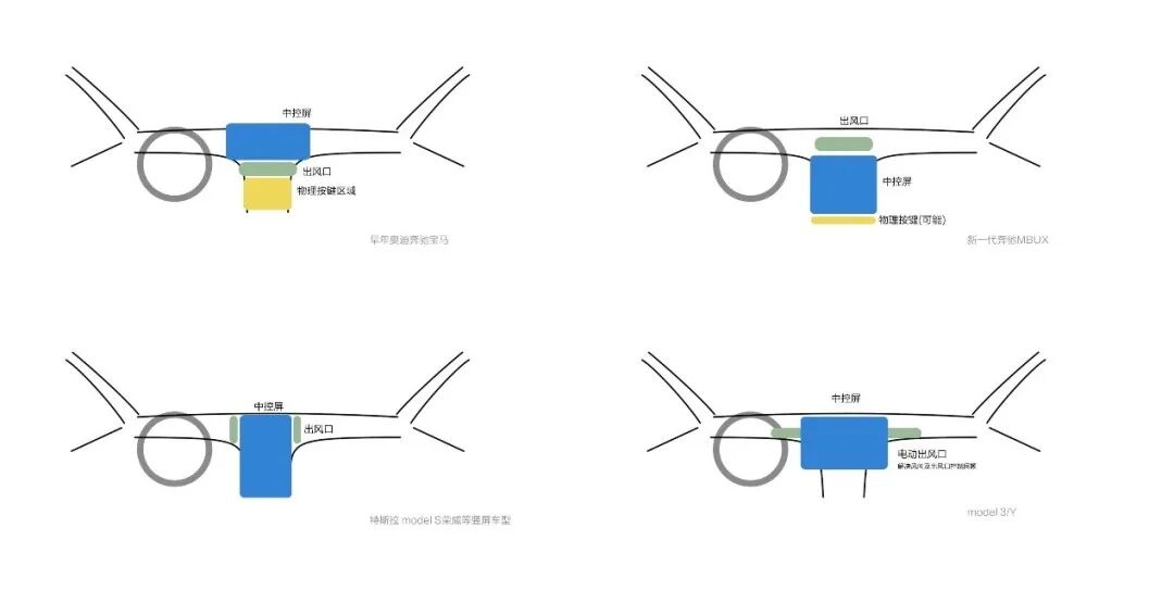 汽车中控区域的布置有三个重要的影响因素,第一是空调出风口的位置,二是中控偏上区域更适合观察,三是中控偏下区域更适合操作。所以,21世纪初的许多汽车都采用了屏幕布置于出风口上方,出风口下方布置物理按键的布局。这一布局由于视野的要求,使得屏幕的大小受到很大限制,也就进一步限制了屏幕的功能(或者像比亚迪一样将出风口继续往下移)。