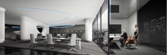 用细胞裂变的功能细分出来酷酷的空间,我们希望整个空间是适应这个主位的,在左边部分完成总裁休息的功能,他到这个位置以后,他感觉整个空间像五星级的酒店。所有的联动是从他自己的独享电梯上来开展的,整个环境会跟随总裁这一个人进行展开和联动,包括所有的灯光的变化。上面是接待区,直接在这条线进入自己的环境。执管的部门,通过小会的碰触完成前期的会议才能进到总裁区域,如果总裁进行更多部门的大型会议,他只用走10几米就直接进入这个非常重要的团队的协作工作里。