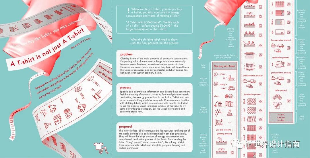 过度消费是一个严重的问题。人们常常买一些不必要的东西,而这些东西最终变成了废物。商业促销活动常常诱导消费者消费。然而,消费者只顾着购买,却忽视了资源浪费和环境污染。衣服标签只会标明衣服的面料和洗涤说明,对消费者形成了误导。LONG 衣服标签能让消费者更多地了解关于自己衣服的故事,如在制作一件T恤的复杂过程中消耗了多少能量等。“Long” 指的是 “更多消费”,就像一张长长的收据,可以激发人们关于减少消费的思考。