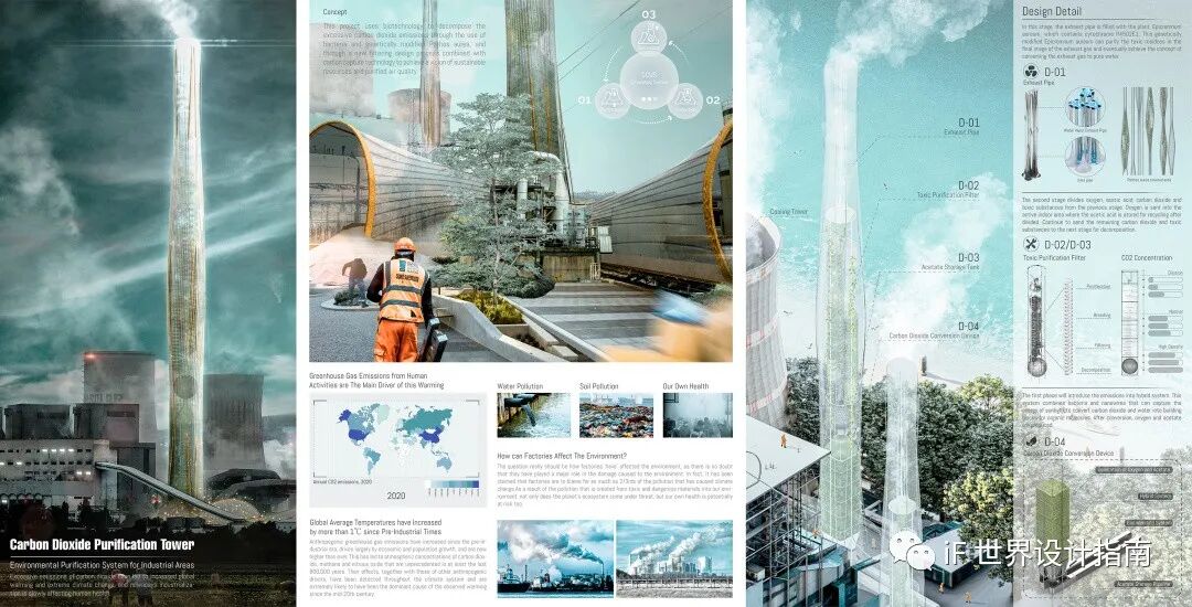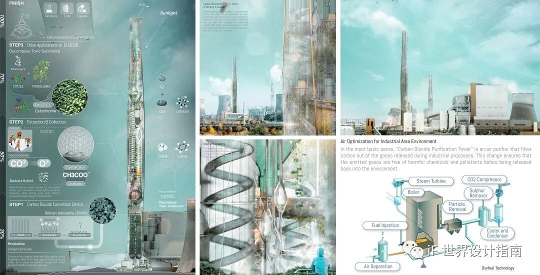 “空气污染过滤塔的设计将为任何城市天际线增添迷人的色彩。它的静态外观可作为一种里程碑和视觉提醒,提醒我们需要改变我们的消费行为以创造一个更健康的环境。同时,它也在悄悄地分解二氧化碳排放,创造清洁空气。”