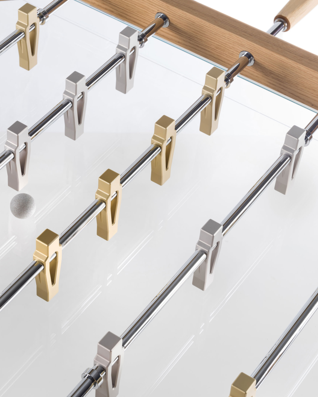 Derby ⾜球桌⽬前提供三种不同的橡⽊版本:⾃然⾊、棕⾊和烟灰⾊。镀铬⾦属杆上22名 “球员”的材质为阳极电镀铝合⾦。与其他所有 IMPATIA 游戏桌⼀样,每⼀张 Derby ⾜球桌都可以根据客户的需求量身定制。