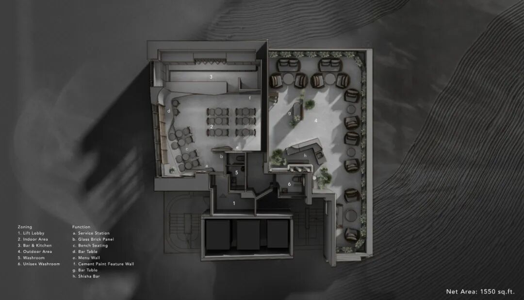 Journey to Ourself In Depth是一家位于繁华的中环中心的咖啡馆,提供优质咖啡、shisha和酒吧服务,也是让人们放慢脚步的避风港。参观者在入口处停下的那一刻,正是与灵魂开始深入对话的时候。灰色阴影由于没有鲜明的色彩,游客可以更专注于自己,而不是被地铁世界分散注意力。不同深浅的灰色被用作主要的颜色主题。不仅要避免在视觉上过于高亢,还要刻画精神“深度”。