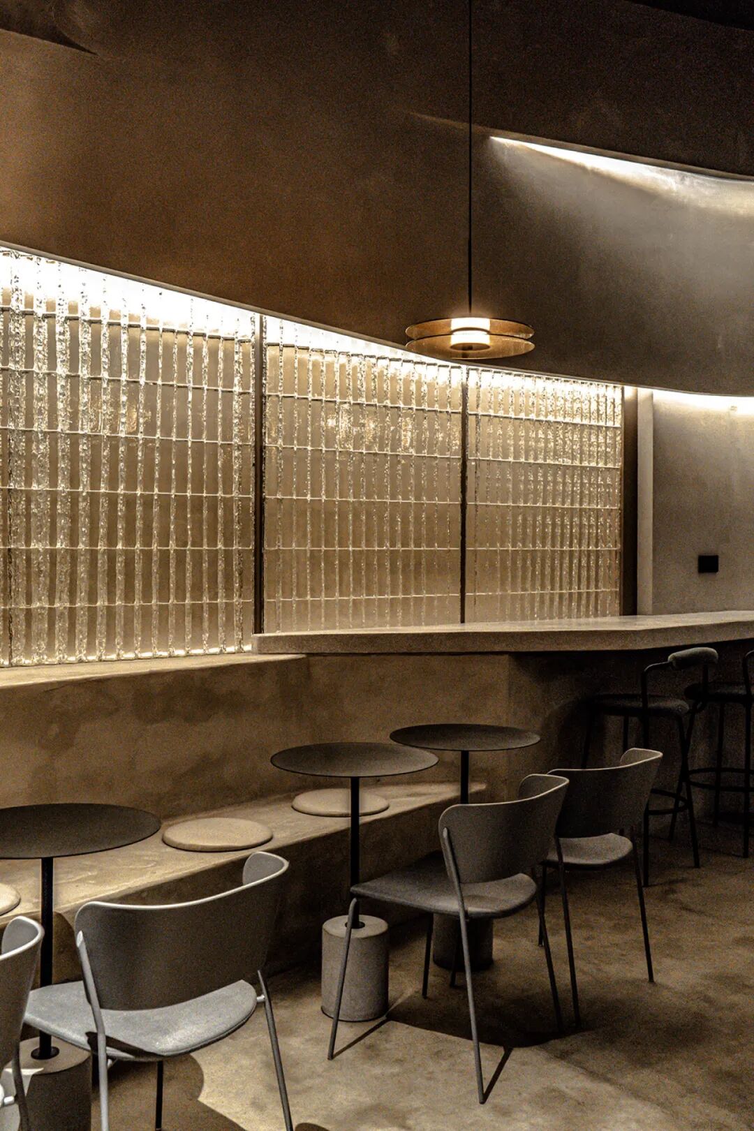 我们用曲线和层次来设计咖啡馆,以说明烟雾和阴影的基本形式。当人们踏入入口时,会出现刚性波和羽状波来捕捉液体的运动。通过波浪形的混凝土座椅,可以看到层层的曲线,以及光线倾泻下来时玻璃砖墙带来的柔和光束反射。