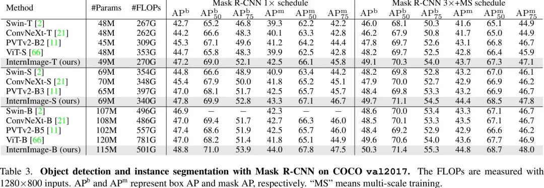 这些结果表明:所提InternImage不仅在常规尺度参数下具有优异性能,同时还可以有效扩展到大尺度参数与数据。